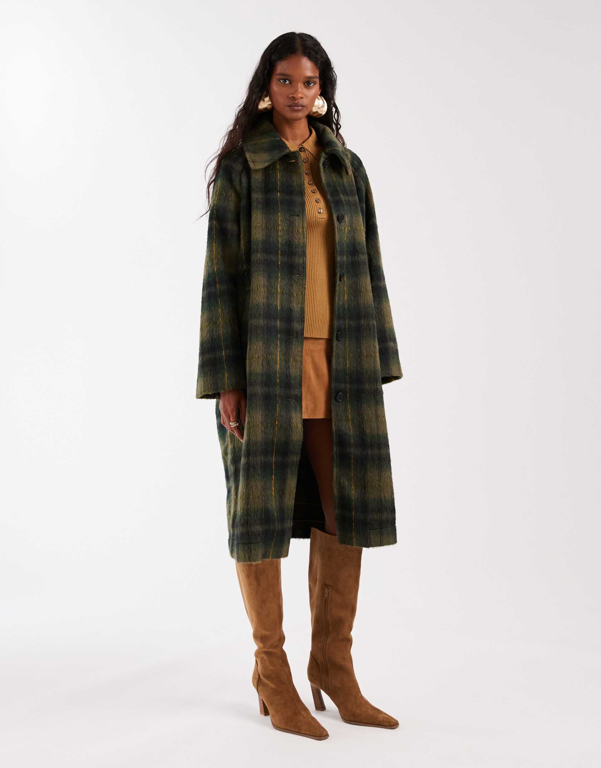 NOISY MAY BRUSHED WOOL LOOK MAXI OVERCOAT IN DARK GREEN PLAID