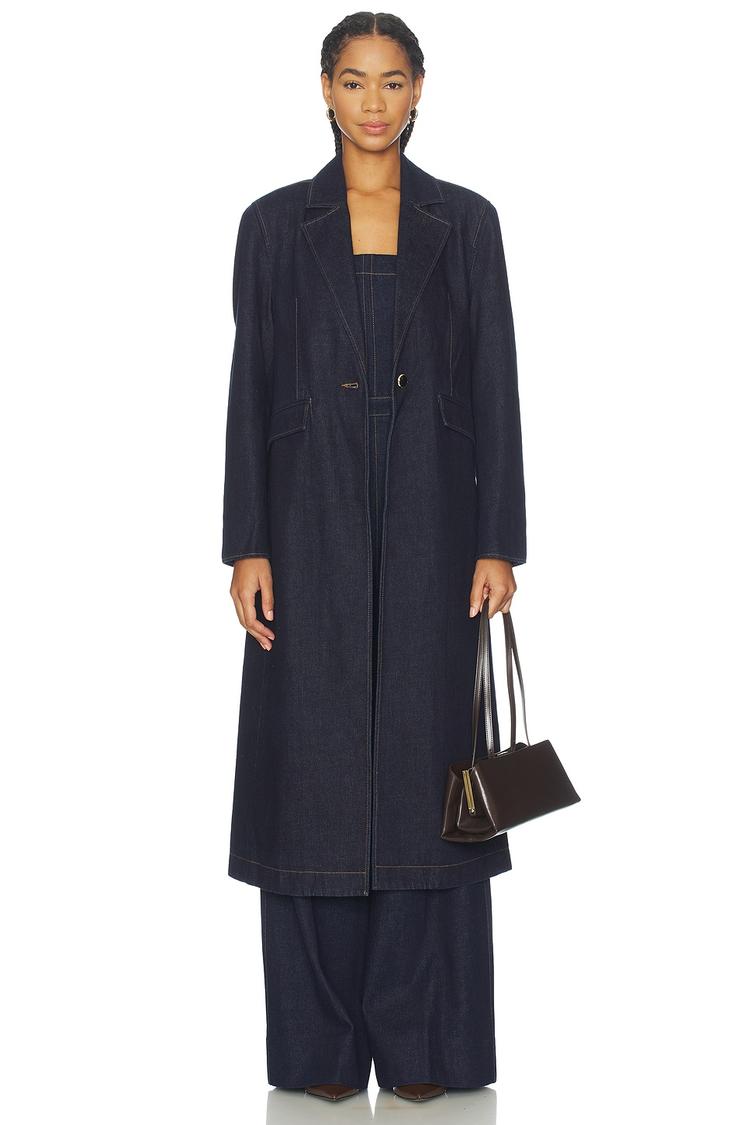 This tailored longline coat in heavyweight dark blue denim offers a sophisticated yet minimalist silhouette ideal for autumn and winter. Featuring a classic notch lapel collar and padded shoulders with epaulettes, it provides structured elegance. The single-breasted front button closure secures the calf-length design, which includes functional faux flap pockets and a back storm flap with vented styling for ease of movement. Lined in smooth polyester for added comfort, this coat is perfect for casual wear, workwear, and business casual occasions.