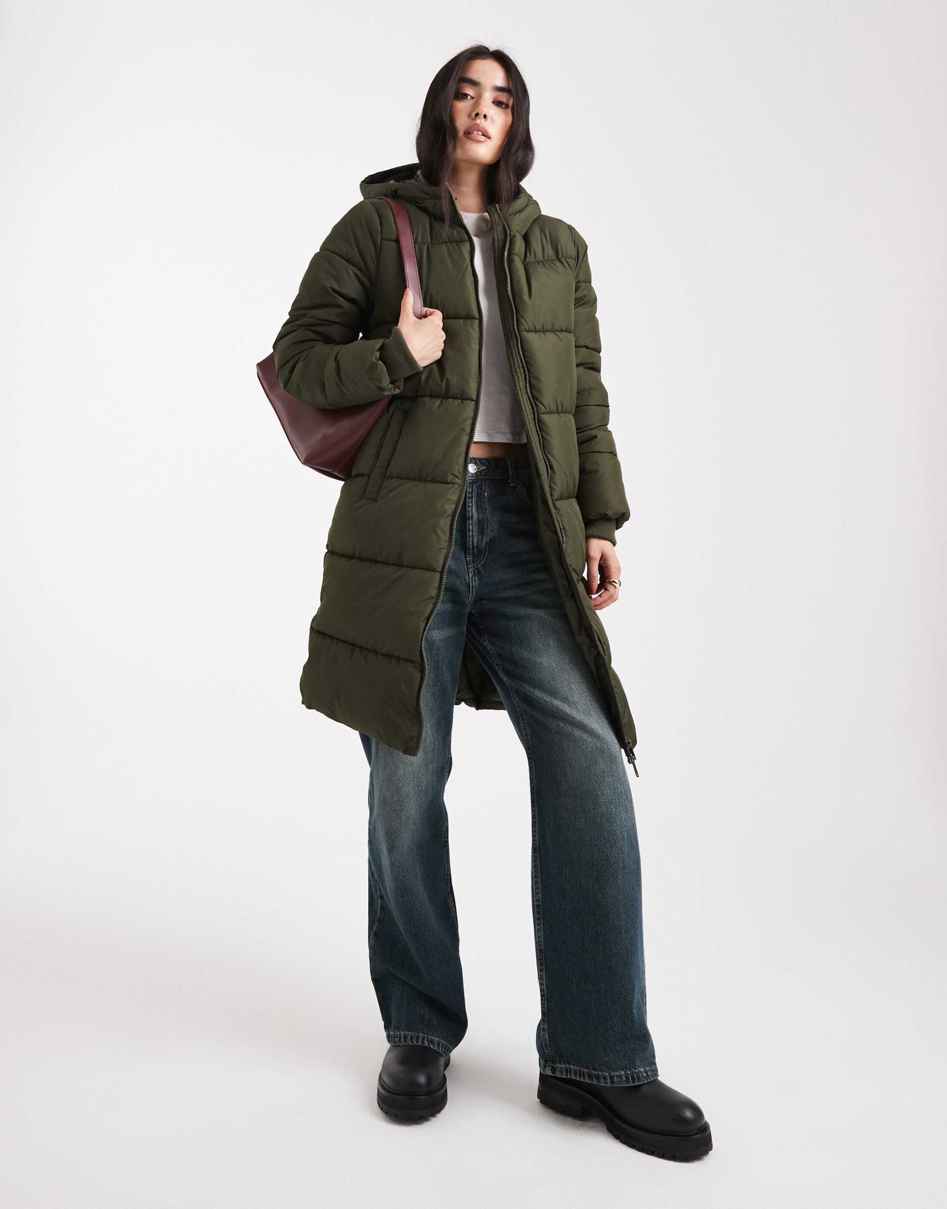 PIECES HOODED LONGLINE PADDED COAT IN DEEP KHAKI