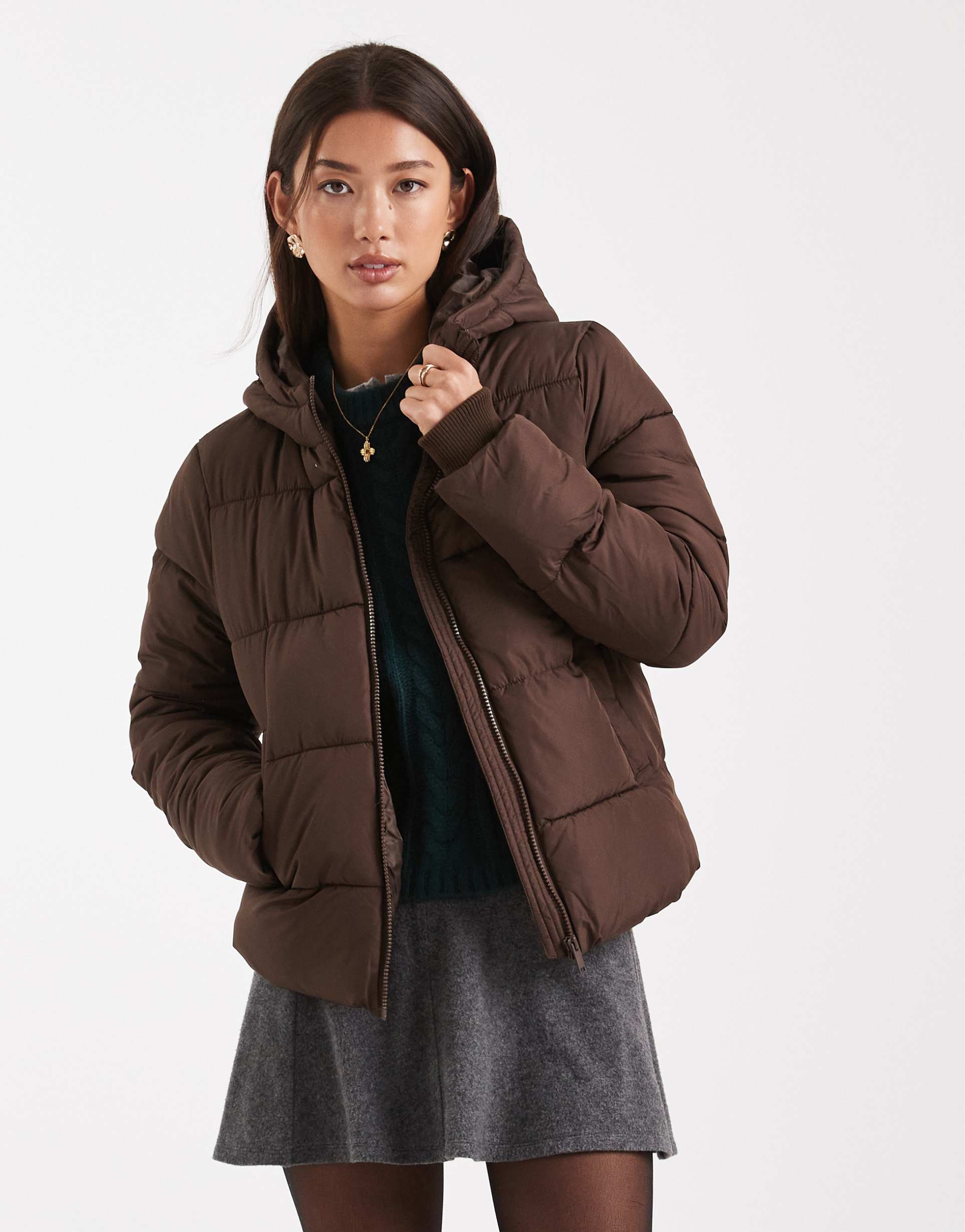 PIECES PADDED COAT WITH HOOD IN CHOCOLATE BROWN