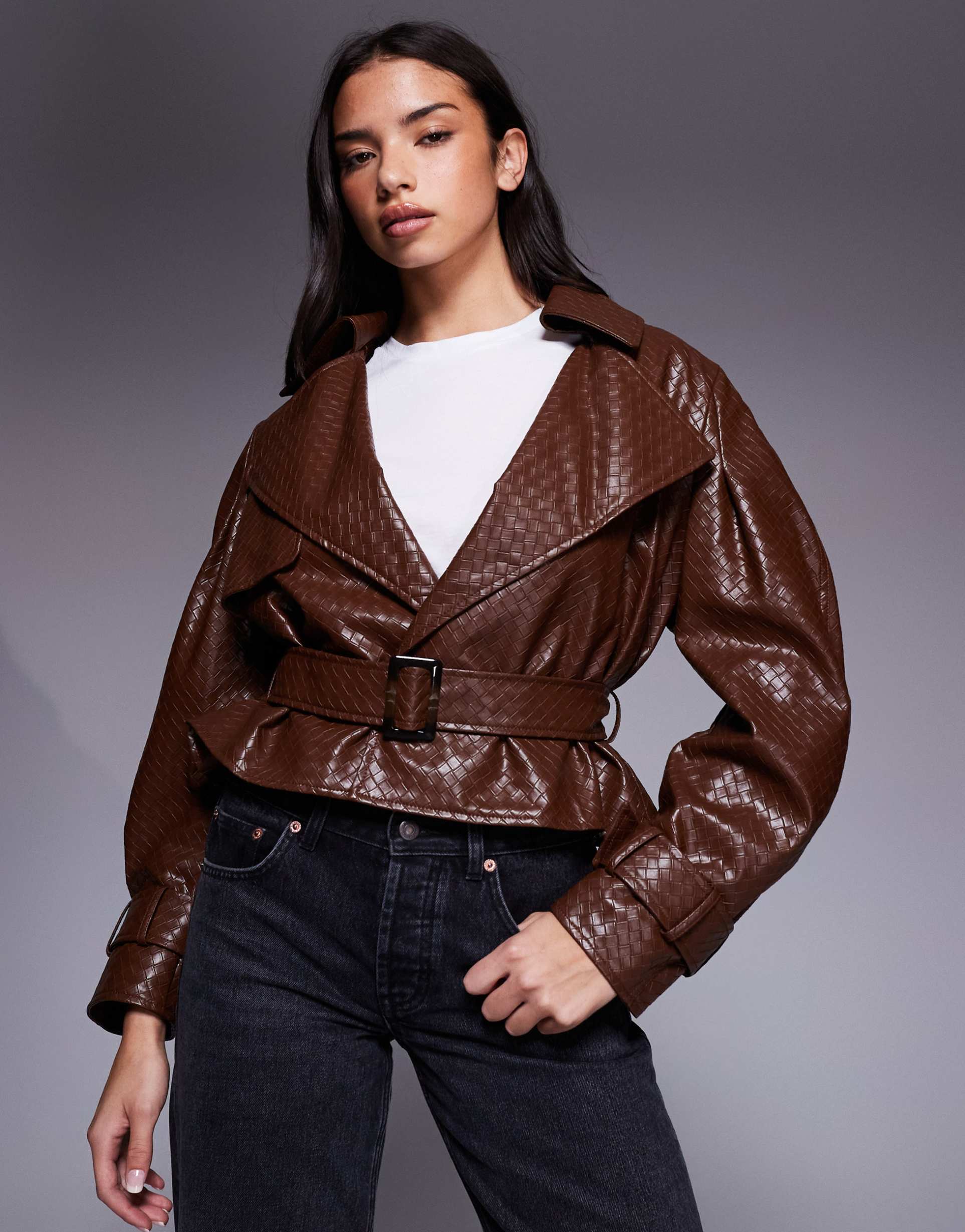 RIVER ISLAND FAUX LEATHER WOVEN BELTED CROPPED TRENCH COAT IN LIGHT BROWN