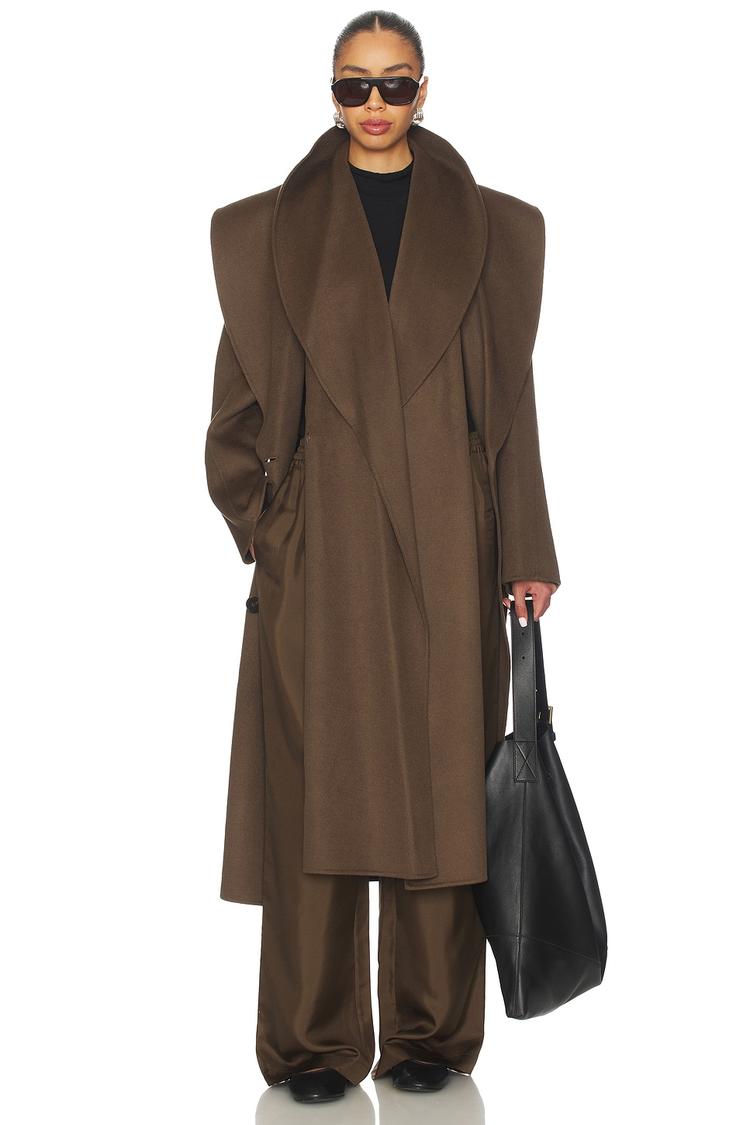 This double-breasted overcoat in rich matte brown wool features a sweeping connected neck scarf that adds elegant warmth and style. The full-length silhouette with a vented back and storm flap detail offers classic sophistication and ease of movement. Designed with long regular sleeves, button-front closure, and side seam pockets, this coat provides both function and refined aesthetics. Perfect for autumn and winter wear, it suits casual, workwear, and business casual occasions, delivering timeless elegance with a practical edge.