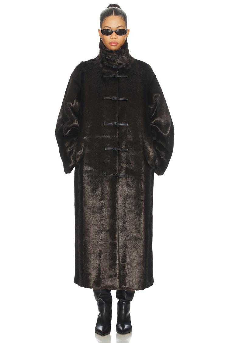 This calf-length faux fur overcoat in a rich matte dark brown hue features a classic loose fit and a sophisticated mandarin collar. Designed with long regular sleeves and toggle button closures at the front, it offers hidden side-seam pockets for functionality. The midweight polyester fabric and polyester lining provide warmth and comfort for autumn and winter seasons. Perfect for casual outings, travel, or refined workwear, this elegant coat elevates any cold-weather wardrobe with its timeless chic appeal.