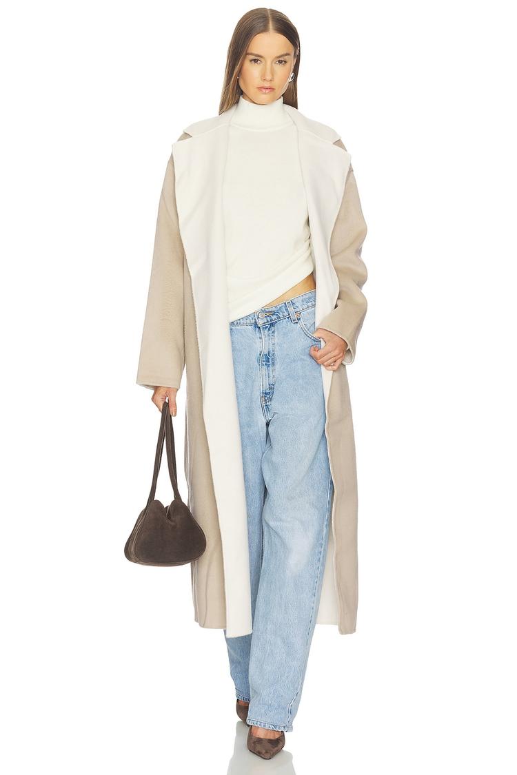 This Anais Longline Single-Breasted coat features a classic beige heavyweight melton wool and cashmere blend fabric, offering warmth and refined texture. It has a full length silhouette with a regular fit, long sleeves, and a notched lapel collar enhancing its elegant appeal. Functional details include a detachable belt tie closure, side seam pockets, and a back storm flap with vented back style. Perfect for casual days, workwear, and business casual settings during autumn and winter, this sophisticated coat combines timeless style with practical comfort.