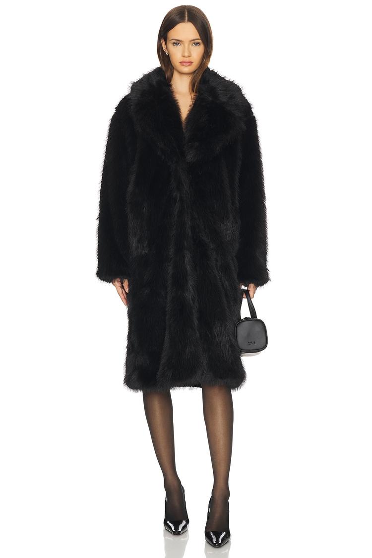 This knee-length faux fur overcoat in matte black exudes timeless elegance with its relaxed fit and cozy turn-down collar. Crafted from soft polyester faux fur with a smooth polyester lining, it offers warmth and sophistication for cooler seasons. The coat features long regular sleeves and a discreet hook-and-eye closure, complemented by two hidden front pockets for practical style. Perfect for casual outings, date nights, or evening events, this classic and chic piece elevates any autumn or winter wardrobe with plush texture and understated luxury.
