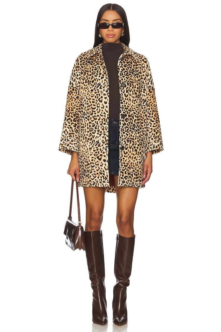 This hip-length car coat features a classic turn-down collar and front button closure, crafted from lightweight faux fur fabric with a bold all-over animal print in beige, black, and brown. Its regular fit and long regular sleeves provide comfortable wear, while side seam pockets add functional appeal. Fully lined with polyester for added comfort, this chic and trendy coat is perfect for casual outings, streetwear styling, and workwear layering during autumn through spring seasons.