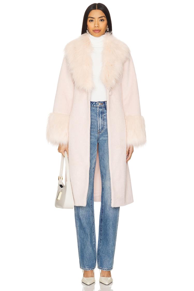 This knee-length, single-breasted coat features a tailored fit that flatters the silhouette with an adjustable waist tie for added shape. Crafted from heavyweight pressed faux fur fabric in a soft light pink hue, it showcases luxurious faux fur trim on the wide lapel collar and cuffs, adding elegant texture. The long sleeves and covered back complete the classic look, while front button closure and slant welt pockets provide functional style. Fully lined with polyester-elastane blend for comfort, this sophisticated coat is perfect for casual outings, workwear, or travel during autumn and winter seasons.