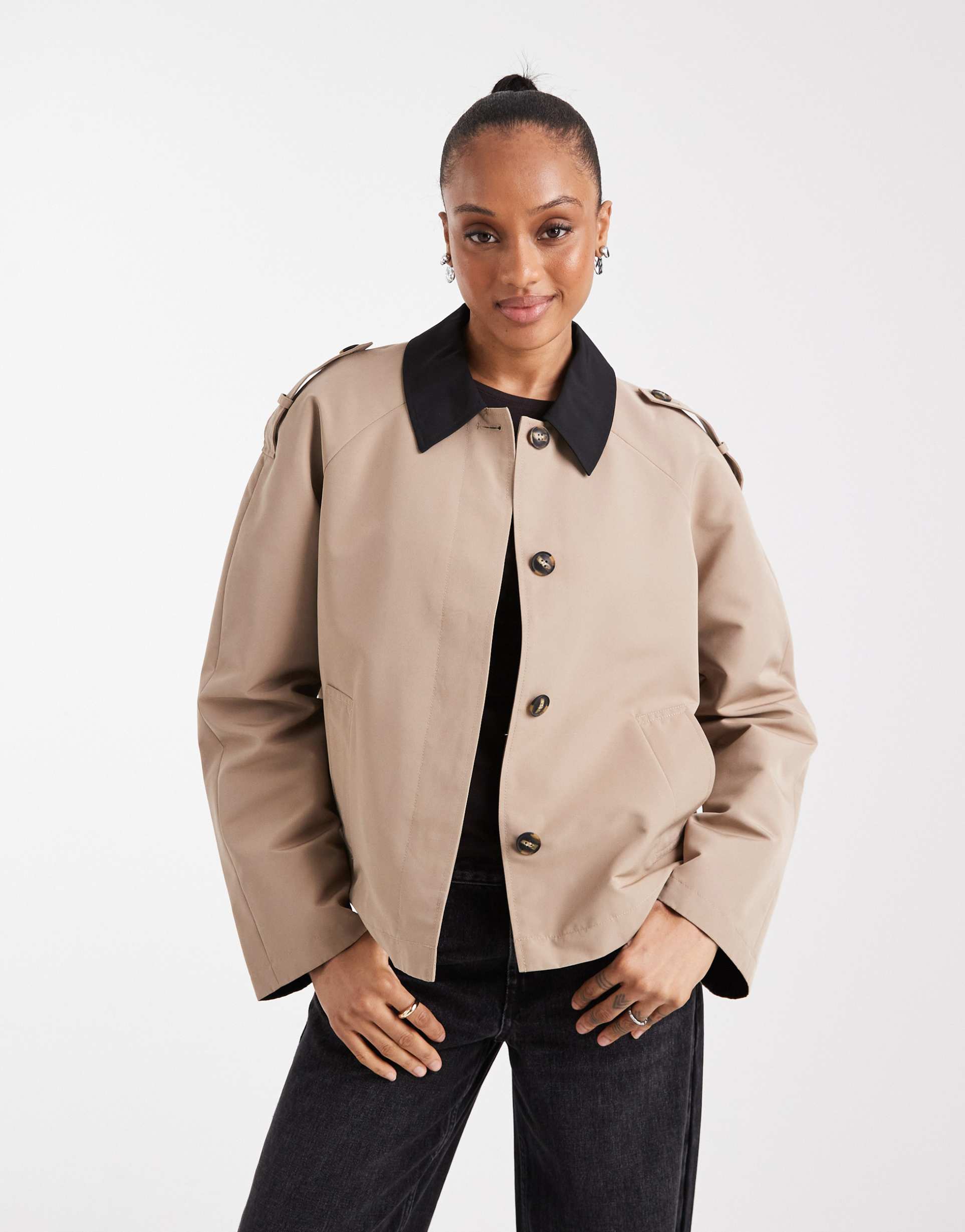 This cropped trench coat by Vero Moda Tall features a classic beige plain-woven polyester fabric with a contrasting black turn-down collar that adds a modern edge. Designed with a button-front closure and epaulettes on the shoulders, it offers a regular fit and long sleeves, perfect for spring and autumn wear. The minimalistic yet sophisticated style makes it suitable for casual outings, workwear, and business casual settings. Its cropped length and clean lines deliver a versatile layering piece for taller frames, combining timeless trench coat elements with contemporary detailing.