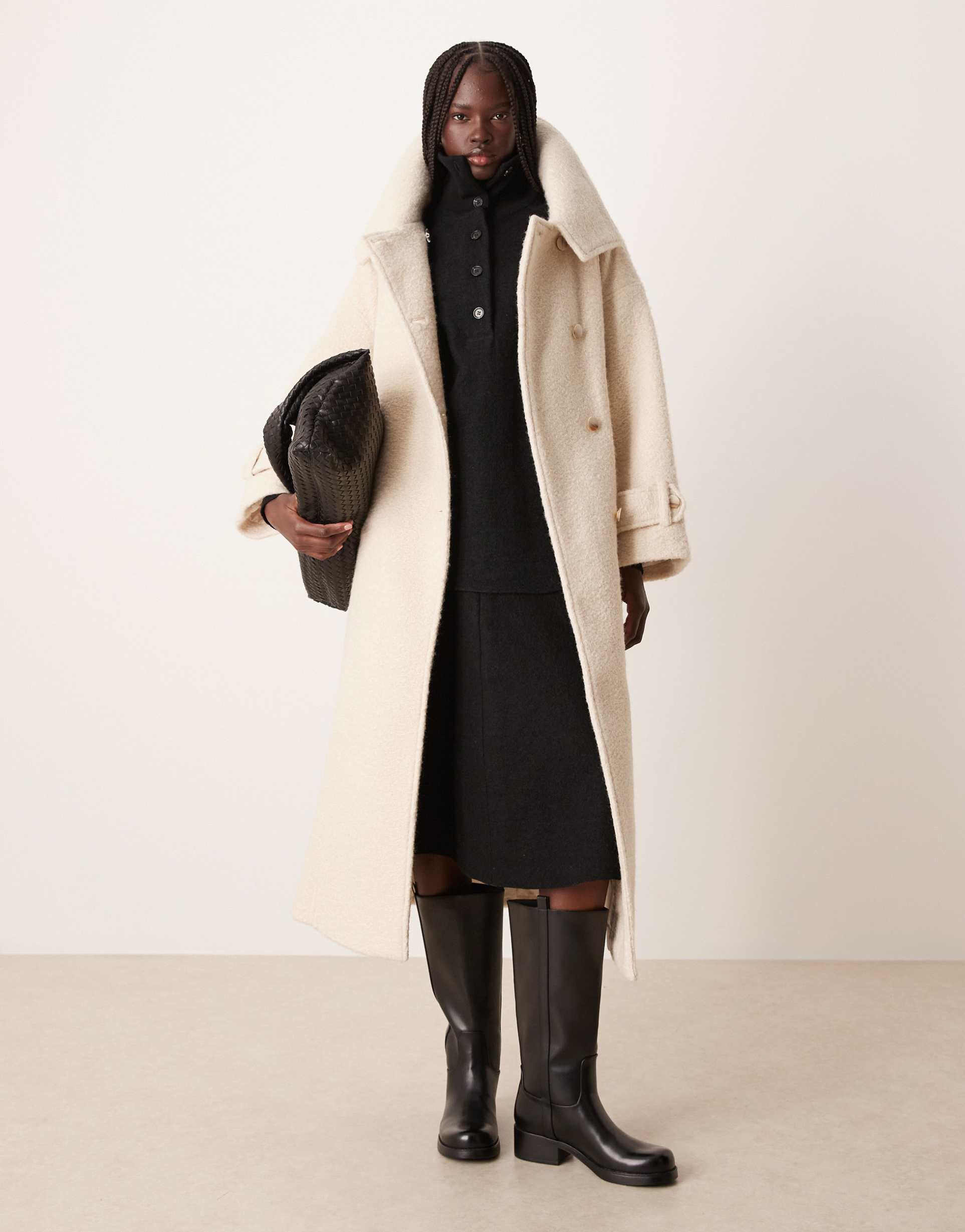 This Vila longline formal coat features a textured boucle fabric in a soft cream hue, offering a luxurious tactile appeal. Designed with an oversized fit and a striking funnel neck, it provides warmth and style for cooler seasons. The coat includes a button placket and a belted waist for adjustable shaping, complemented by functional pockets and long sleeves with buttoned cuffs. Its classic and minimalist aesthetic makes it perfect for casual, workwear, and business casual occasions, combining elegant simplicity with cozy comfort.
