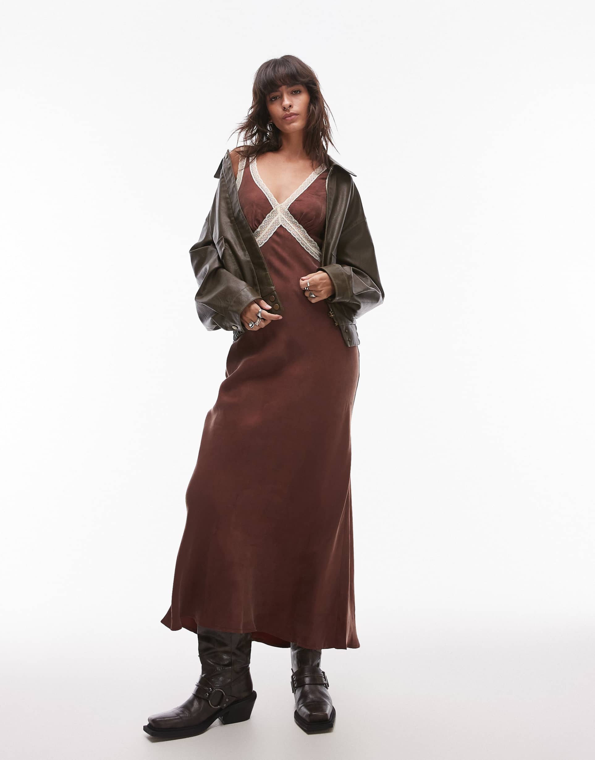 Soft matte brown fabric and a flowing maxi silhouette define this slip dress, perfect for weekend plans and casual chic occasions. The deep plunge neckline and sleeveless design offer a minimalist yet elegant appeal, complemented by delicate lace trim along the bodice front. Crafted from a smooth blend of cupro and rayon, it provides comfortable wear with a regular fit. Ideal for brunch, date nights, or relaxed casual events, this dress blends effortless style with subtle feminine details for versatile wardrobe appeal.