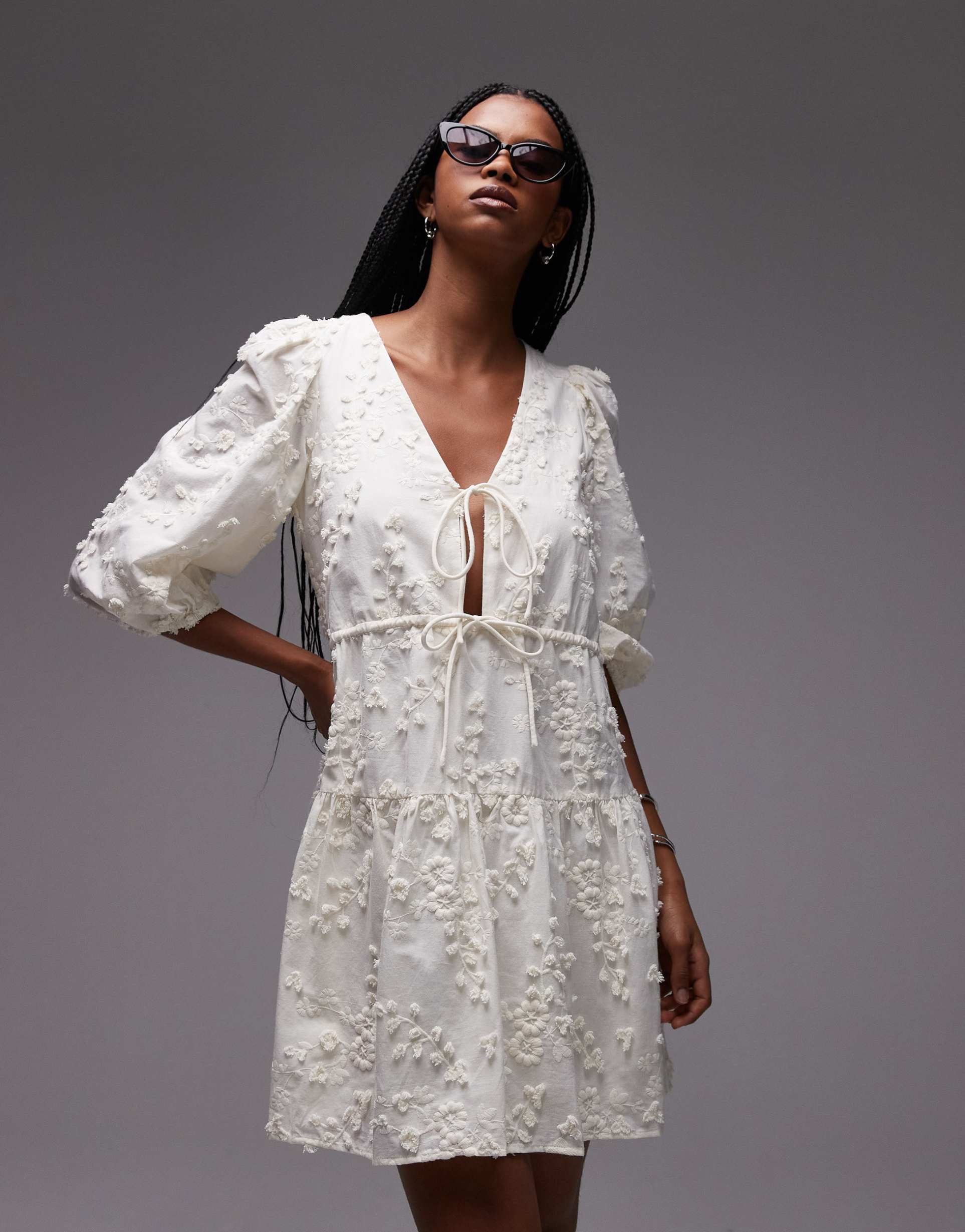 & OTHER STORIES EMBROIDERED MINI DRESS WITH FRONT TIE DETAIL AND TIERED HEM IN LIGHT BEIGE