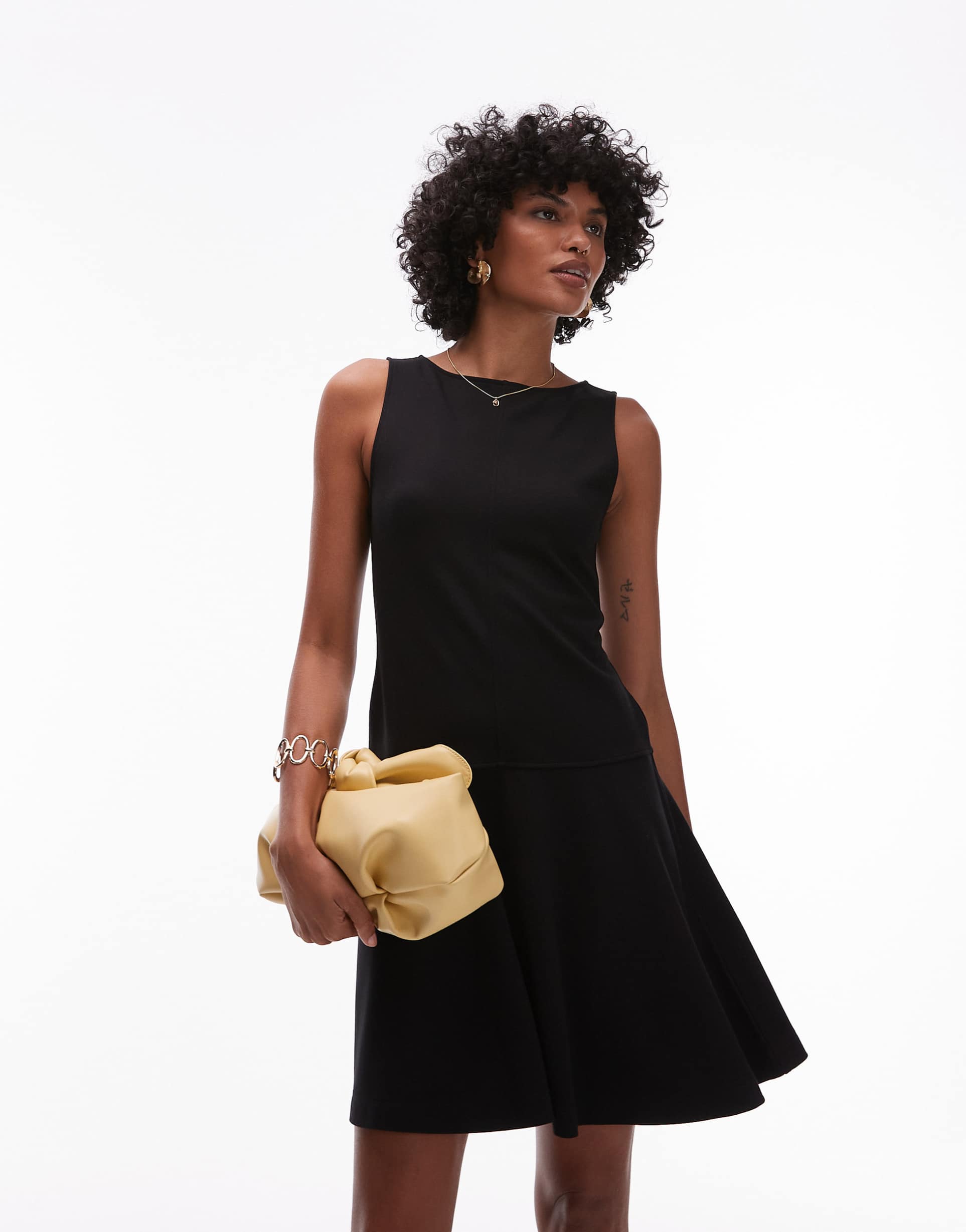 Soft and stretchy jersey fabric shapes a slim fit mini dress featuring a classic boat neckline and sleeveless styling. The flared skater hem adds playful movement to the clean, minimalist silhouette. This versatile black dress transitions effortlessly from casual brunches to relaxed date nights and everyday wear. Its comfortable stretch fabric and timeless A-Line shape make it a chic choice for all seasons and occasions.