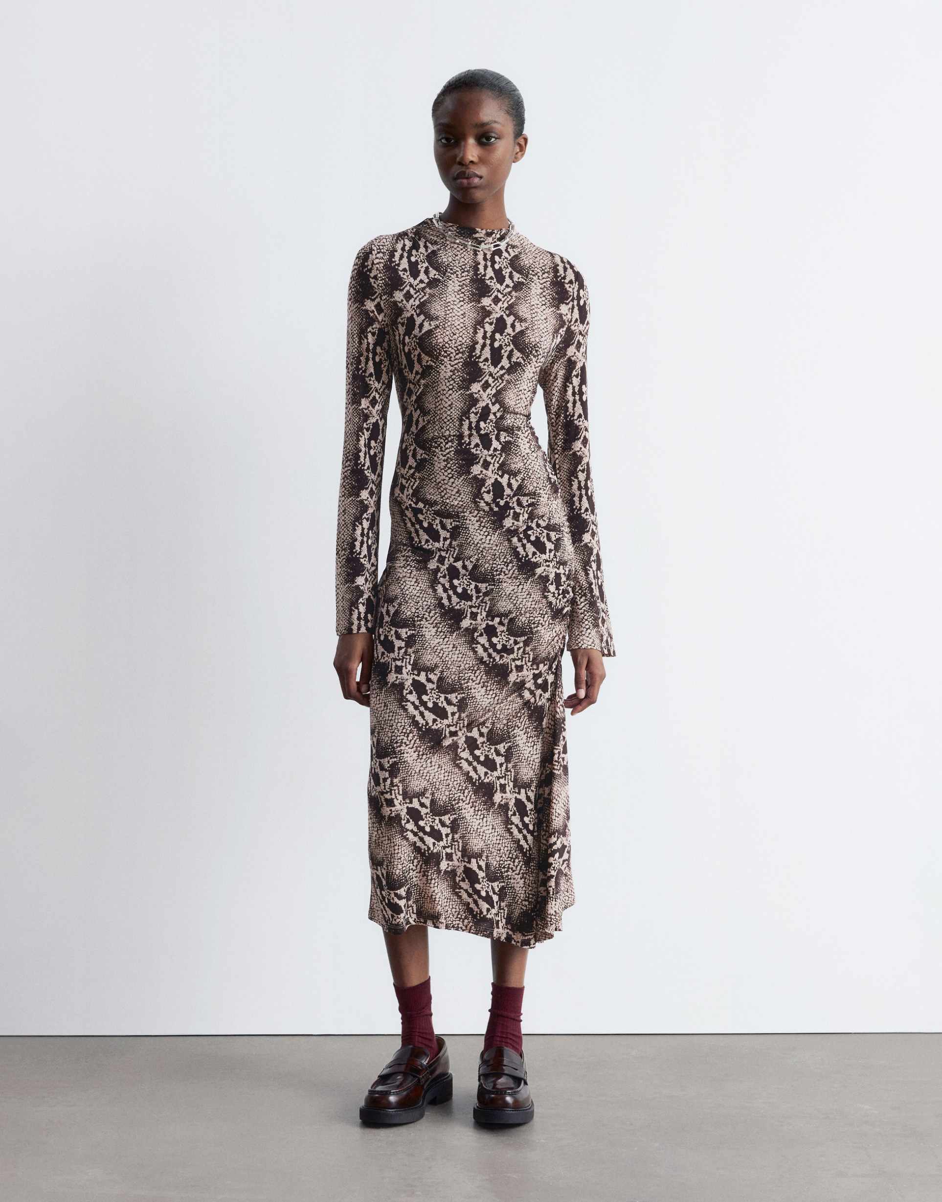 & OTHER STORIES JERSEY LONG SLEEVE MIDAXI DRESS WITH RUCHED SIDE DETAIL IN BROWN SNAKE PRINT