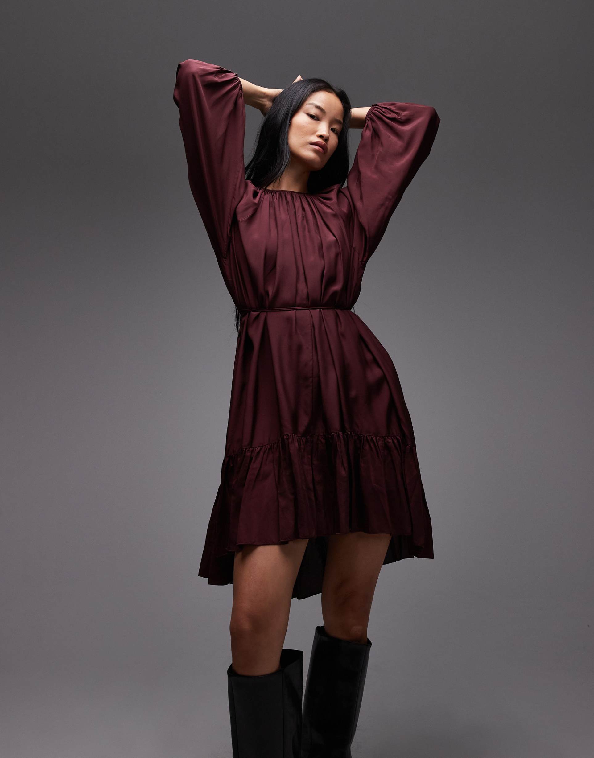 & OTHER STORIES LONG SLEEVE FLOATY MIDI DRESS WITH RUFFLE DETAIL IN BURGUNDY