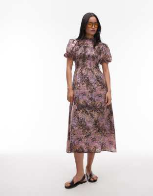 Soft crepe fabric with a lightly wrinkled texture enhances this lilac abstract print midi dress featuring a high neckline and puffed half sleeves. The shirred bodice with smocking detail provides a regular fit that flatters effortlessly. A buttoned keyhole back adds a delicate touch to its elegant silhouette. This dress is perfect for spring and summer occasions like brunch, date nights, or cocktail events, combining modern style with comfortable wearability.