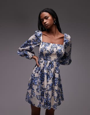 & OTHER STORIES SQUARE NECK MINI DRESS WITH SHIRRED BODICE IN BLUE FLORAL PRINT