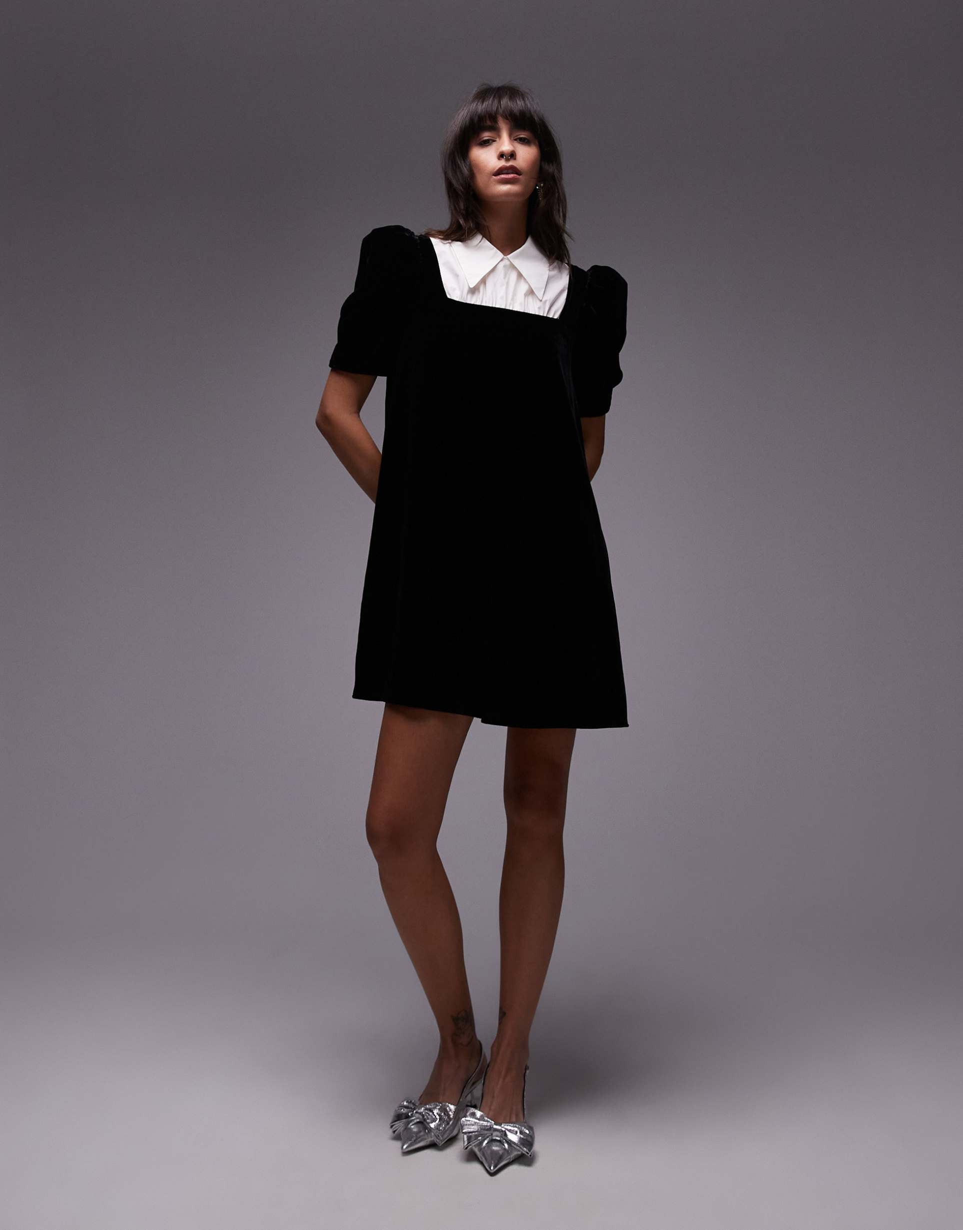 Feel instantly chic in this & Other Stories velvet mini dress. The deep black velvet gleams softly, offset by a crisp white spread collar that elevates the look with a smart, preppy edge. Puff sleeves add playful volume, while a regular-fit shift silhouette flatters without cling for easy movement. The back features a neat button placket, lending a subtle, fashion-forward detail. Perfect for cocktails, date nights, or festive gatherings, it pairs beautifully with heel boots or sleek loafers and a tailored blazer for versatile, city-ready styling.