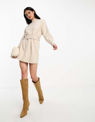 Soft mid-weight knit in a light beige hue defines this sweater dress featuring a high neck and relaxed drop shoulder sleeves. The mini length and belted waist create a flattering silhouette, perfect for everyday casual wear or polished workwear looks. Its regular fit and long sleeves make it an ideal choice for cooler autumn and winter days, combining cozy comfort with minimalist style for brunch outings or casual meetings.