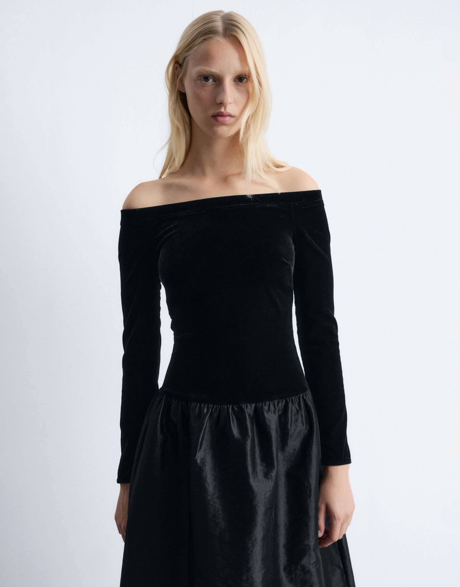 Soft mixed velvet and satin fabrics combine to create an elegant maxi dress with a fitted waist and an off-shoulder Bardot neckline. The long sleeves and regular fit offer a classic silhouette, while the ruffled peplum hem adds a sophisticated touch to the flowing A-line skirt. Perfectly suited for formal events, cocktail parties, and night outs during autumn and winter, this dress exudes timeless charm and refined style.