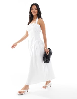 4TH & RECKLESS PETITE POPLIN SQUARE NECK HALTERNECK DROP WAIST PUFF SKIRT MAXI DRESS IN WHITE