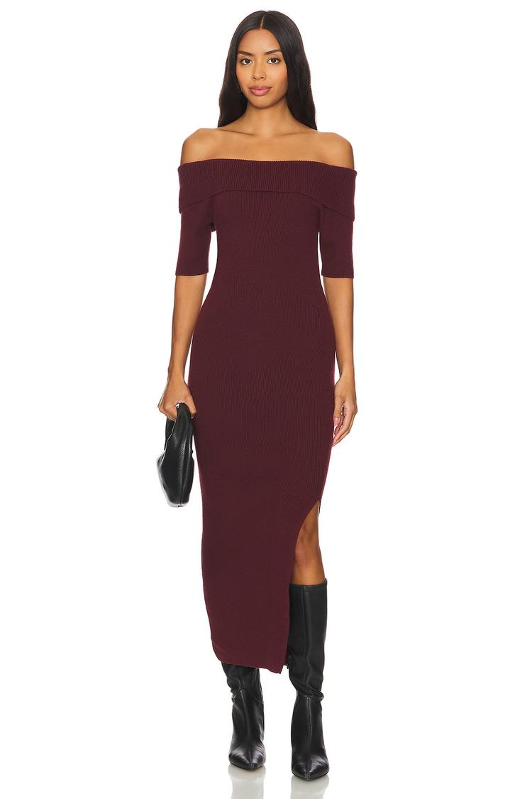 A sleek silhouette meets cozy knit fabric in this off-shoulder midi dress, featuring a flattering fitted cut and a tasteful side slit that adds a hint of allure. The rich burgundy hue complements the elbow-length sleeves and clean hemline, making it an elegant choice for autumn and winter evenings. Perfect for cocktail parties, date nights, or nights out, this minimalist yet sexy dress offers effortless style and comfort with its pullover design and soft polyester knit construction.
