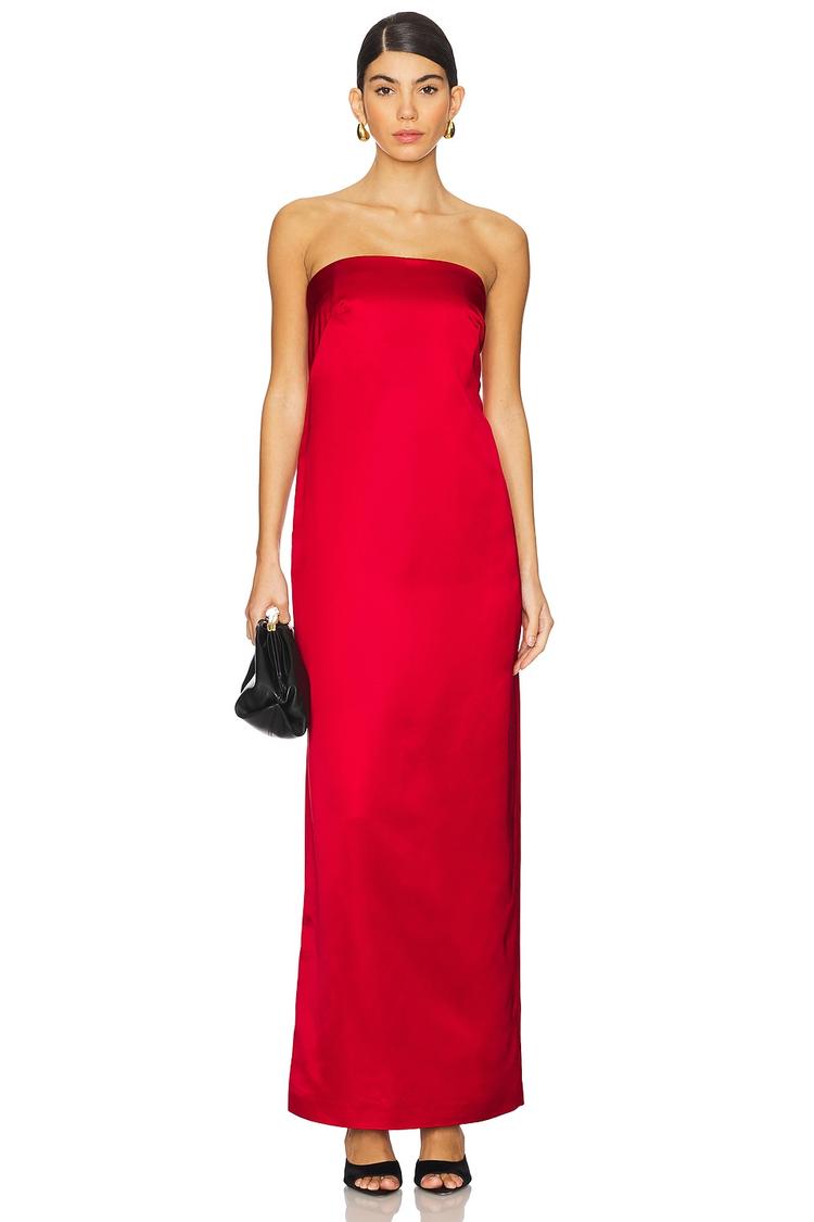 Sleek and sophisticated, this strapless column gown in rich red satin offers a fitted silhouette that skims the figure gracefully. Crafted from heavyweight viscose satin with a fully lined interior, it features a boned bodice with silicone grip trim for secure wear and side seam pockets for practicality. The clean hemline and invisible back zipper closure add to its polished look, making it an impeccable choice for cocktail events, formal occasions, and galas. This elegant gown blends classic design with modern functionality, perfect for making a confident statement.