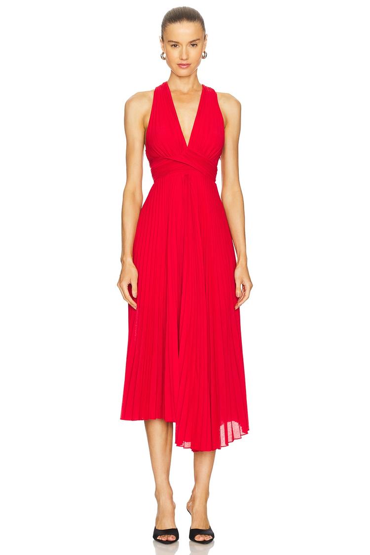 red pleated midi dress