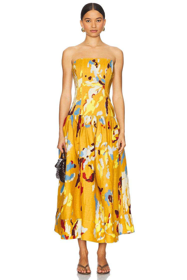 Sunlit afternoons come alive with this strapless, fit and flare midi dress featuring a boned bodice for structured elegance. Crafted from a midweight blend of linen, viscose, and polyester, it offers breathable comfort with a vibrant abstract print in yellow accented by splashes of white, brown, blue, and red. The concealed side zipper and clean hemline enhance its sleek silhouette, making it ideal for brunches, date nights, or cocktail events during spring and summer.