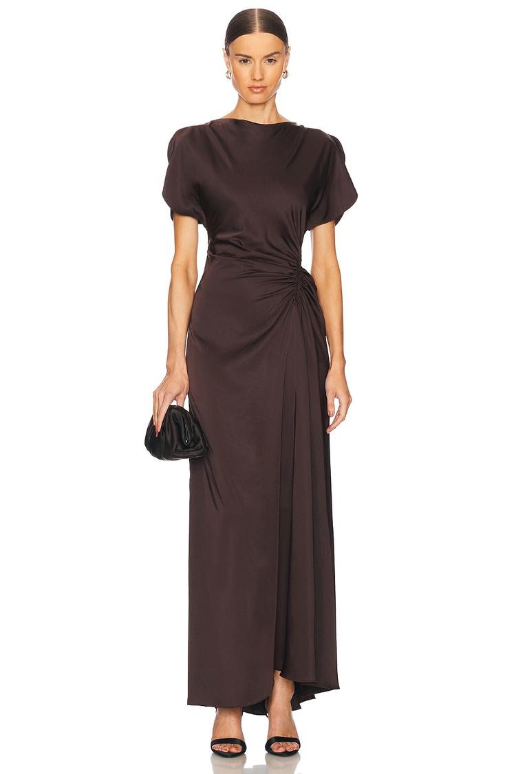 Matte black satin fabric sculpts a sleek column silhouette with a maxi length, perfect for refined occasions. The dress features a round neckline and short regular sleeves, complemented by side ruching that adds elegant texture and a flattering fit. Concealed back zipper closure enhances the minimalist design, making it a sophisticated choice for cocktail events, semi-formal gatherings, or formal evenings. Its slim fit and clean hemline create a timeless and polished look suitable for all seasons.