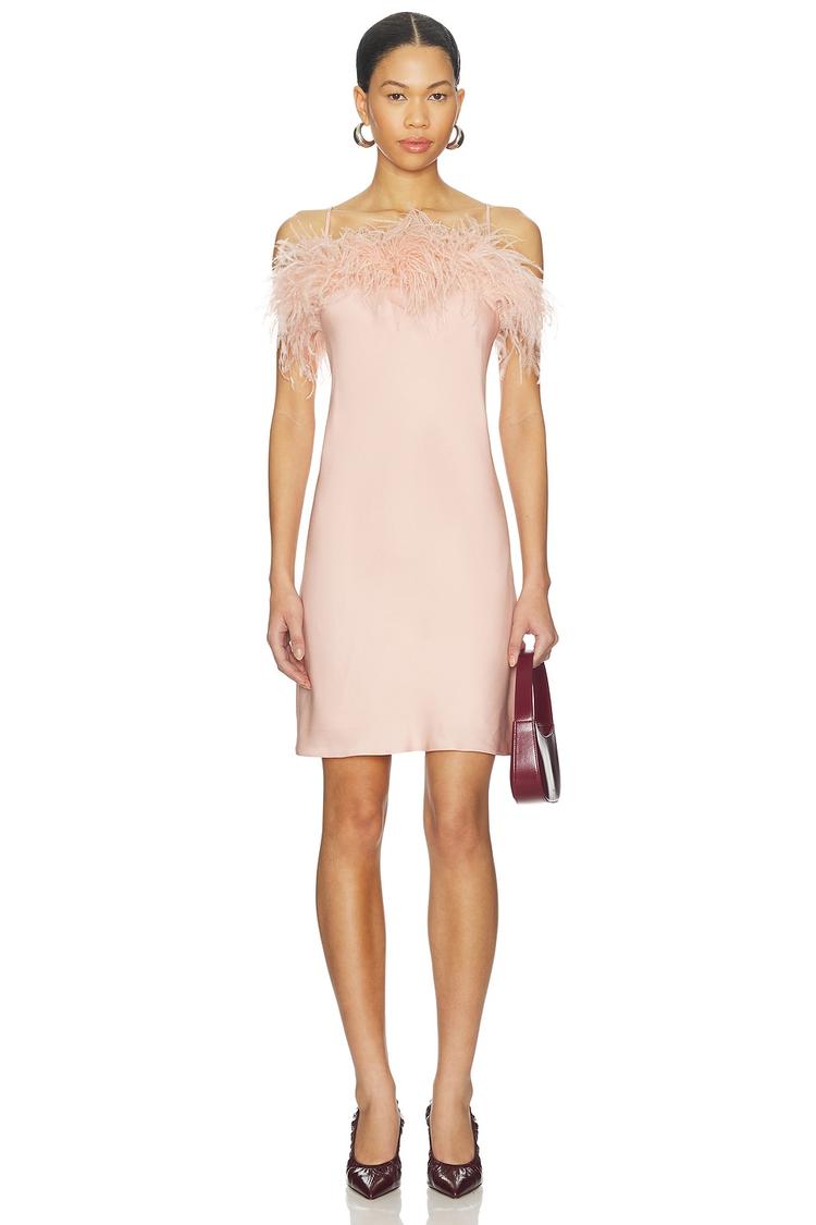 Soft blush crepe fabric and a sleek slip dress silhouette create a sophisticated look with a straight neckline and delicate spaghetti straps. The mini length and slim fit make it perfect for warm spring and summer evenings. Real ostrich feather trim along the collar adds luxe texture and visual interest, while adjustable straps ensure a custom fit. Fully lined for comfort, this elegant dress suits cocktail parties, date nights, and chic night outs with effortless style.