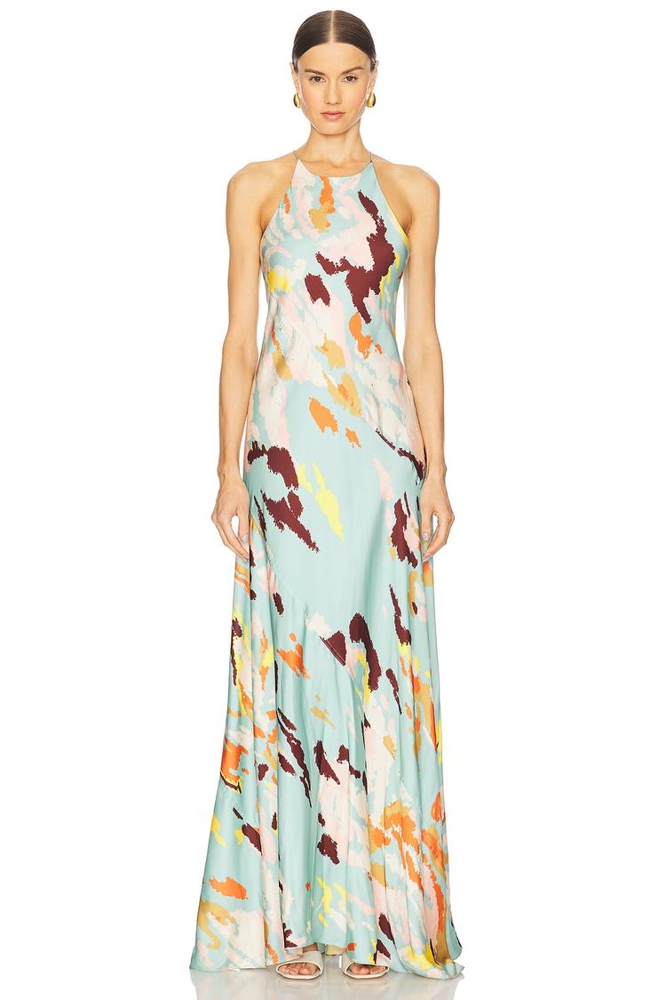 Soft satin fabric drapes elegantly in this fitted column dress featuring a halter neckline and sleeveless styling, perfect for warm spring and summer evenings. The floor-length maxi silhouette flows smoothly with a clean hemline, while an abstract all-over print in muted tones of burgundy, mustard, and beige adds modern sophistication. A hidden side zipper maintains the sleek look. Ideal for formal events, cocktail parties, and romantic date nights, this dress combines timeless elegance with contemporary flair.