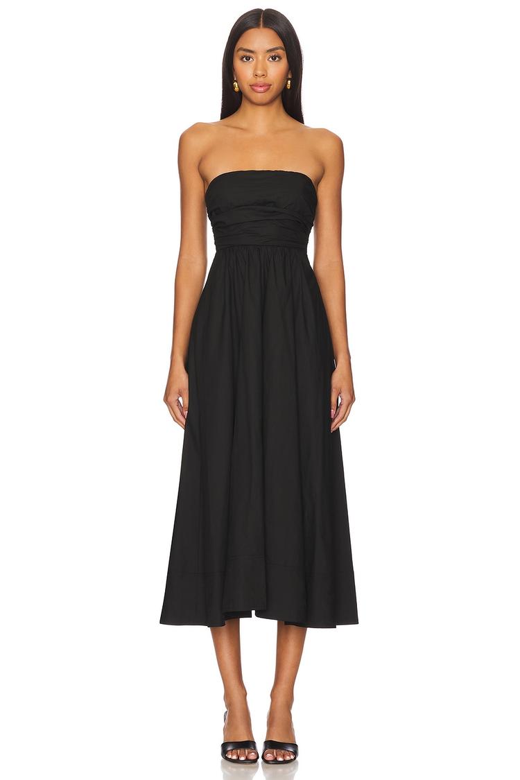 A timeless matte black cotton dress features a strapless, fitted bodice that flows into a classic A-line midi skirt with a clean hemline. The invisible back zipper ensures a smooth silhouette, while the lightweight cotton fabric offers breathable comfort perfect for spring and summer days. Its minimalist elegance makes it versatile for casual outings, brunch dates, cocktail parties, or wedding guest occasions, blending sophistication with effortless style.