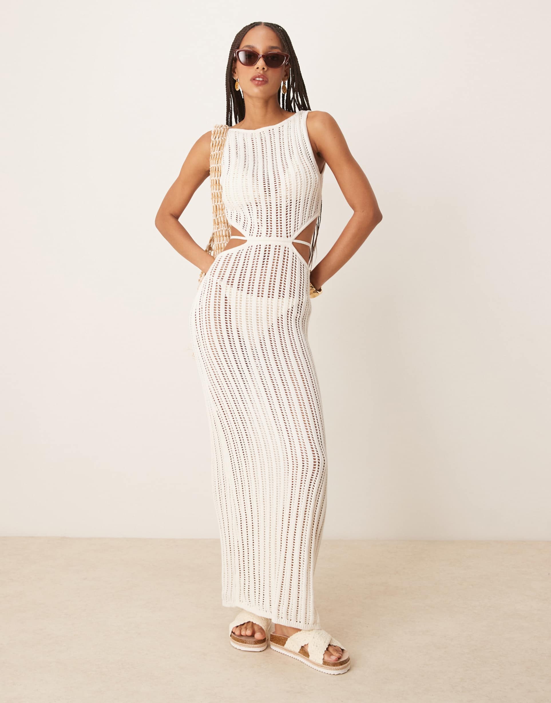 ABERCROMBIE & FITCH TEXTURED SLASH NECK CUT-OUT WAIST MAXI DRESS IN CREAM