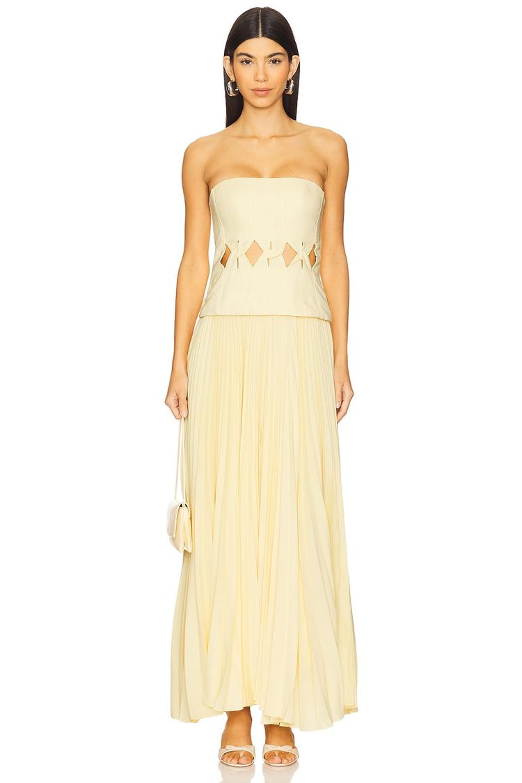 Soft crepe fabric shapes a fitted, strapless column silhouette that flows into a contrasting plisse maxi skirt. The matte cream hue and geometric cut-outs at the front bodice add a modern elegance to this fully lined dress with a hidden back zipper closure. Ideal for spring and summer occasions, it pairs beautifully for cocktail parties, formal events, and wedding guest attire. The boned bodice ensures a flattering fit while the clean hemline maintains a sleek finish, making it an effortlessly sophisticated choice for your refined wardrobe.