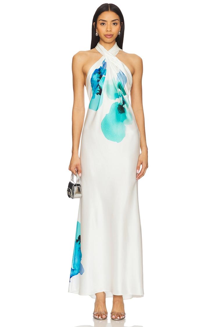 Soft satin twill fabric and a sleek column silhouette create a stunning maxi dress with a halter neckline and sleeveless design. The draped fabric accent at the front adds elegant detail, complemented by striking teal and blue floral patterns. Perfectly suited for spring and summer occasions, this dress shines at cocktail parties, formal events, and weddings. The hidden side zipper and button loop closure ensure a smooth fit, making it a timeless, sophisticated choice for elevated date nights and special celebrations.