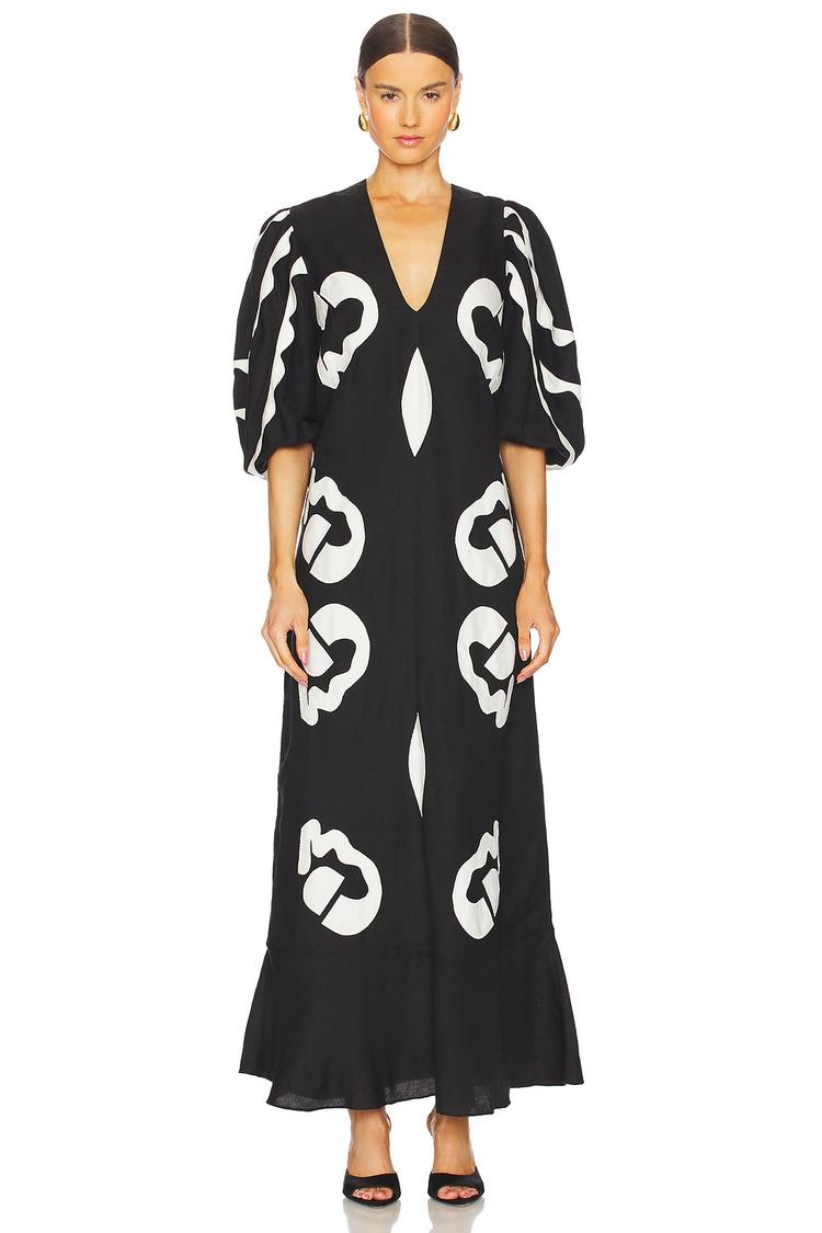 Relaxed yet elegant, this matte black midi shift dress features an eye-catching abstract white applique pattern all over. Crafted from a breathable linen-viscose blend, it offers comfort and style with its three-fourth balloon sleeves and flattering V-neckline. The ruffled hemline adds a subtle feminine touch, perfect for spring and summer occasions. Designed for easy pullover wear, this chic dress suits brunches, date nights, and cocktail events with effortless sophistication.
