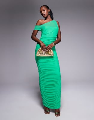 Bold in bright green, this midaxi sheath dress features a sleek asymmetric neckline and a striking one-shoulder strap design. Crafted from a fine, stretchy mesh blend of polyester and spandex, it offers a soft, sheer texture combined with all-over ruching that enhances its slim fit silhouette. The clean hemline adds to its modern allure. Ideal for cocktail parties, date nights, or an elegant night out, this versatile dress melds sexy sophistication with contemporary style.