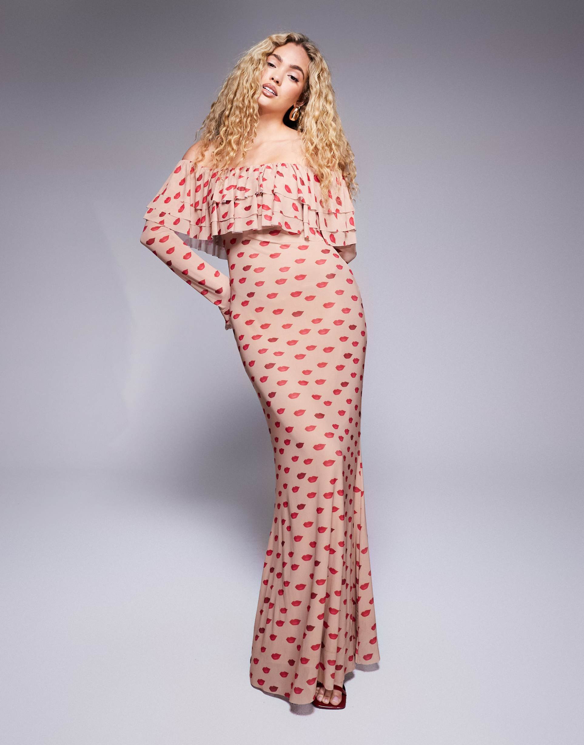 Dresses by AFRMA staple event outfitOff-shoulder styleTiered designLong sleevesAll-over kiss print Flared hemRegular fitProduct Code: 140663135Mesh: fine, soft and sheer Main: 95% Polyester, 5% Spandex.