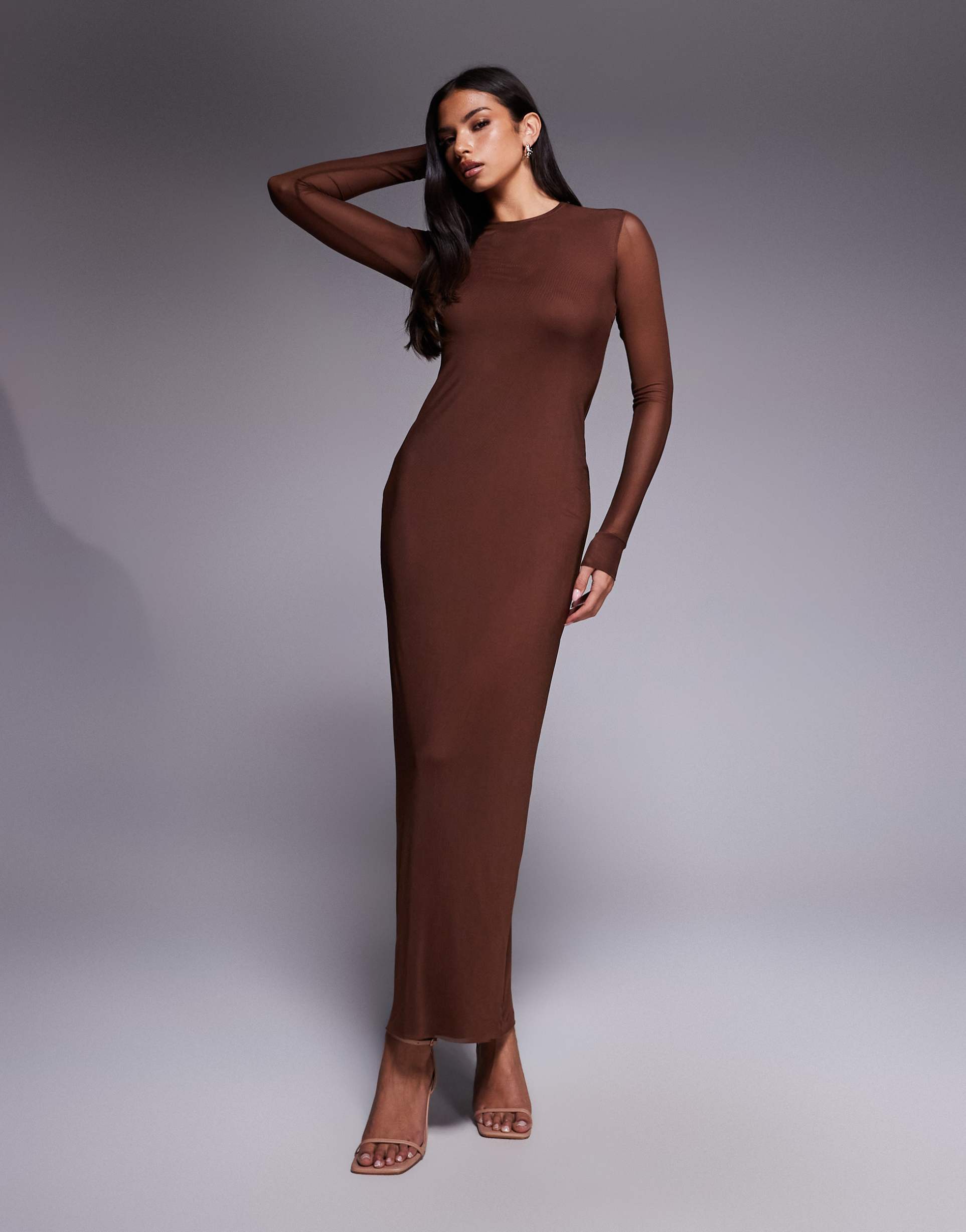Soft mesh fabric with a fine, stretchy texture shapes a sleek sheath silhouette in a matte cappuccino brown. The regular fit midaxi length and classic round neckline are complemented by long sheer sleeves, creating an elegant and sophisticated look. Clean hemlines and subtle sheerness add modern minimalism to this versatile dress, perfect for cocktail evenings, date nights, and night outs. The blend of polyester and elastane ensures comfort and stretch while maintaining a polished finish suitable for all seasons.