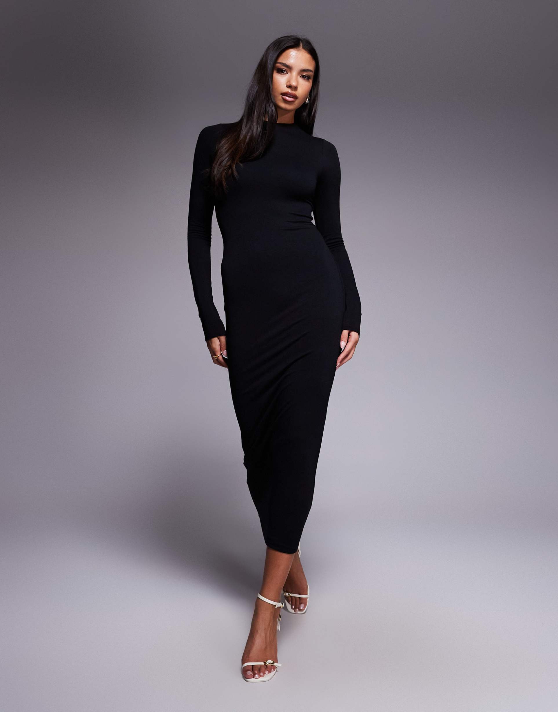 A sleek matte black maxi dress crafted from soft, stretchy jersey knit fabric offers a slim, figure-hugging silhouette with a high neck and long sleeves. This minimalist sheath design features clean hemlines and a sophisticated profile, ideal for elegant evenings, cocktail parties, or night outs. The comfortable knit fabric blends rayon and spandex for a flattering fit that moves with you, making it a versatile choice for transitional seasons and year-round wear.