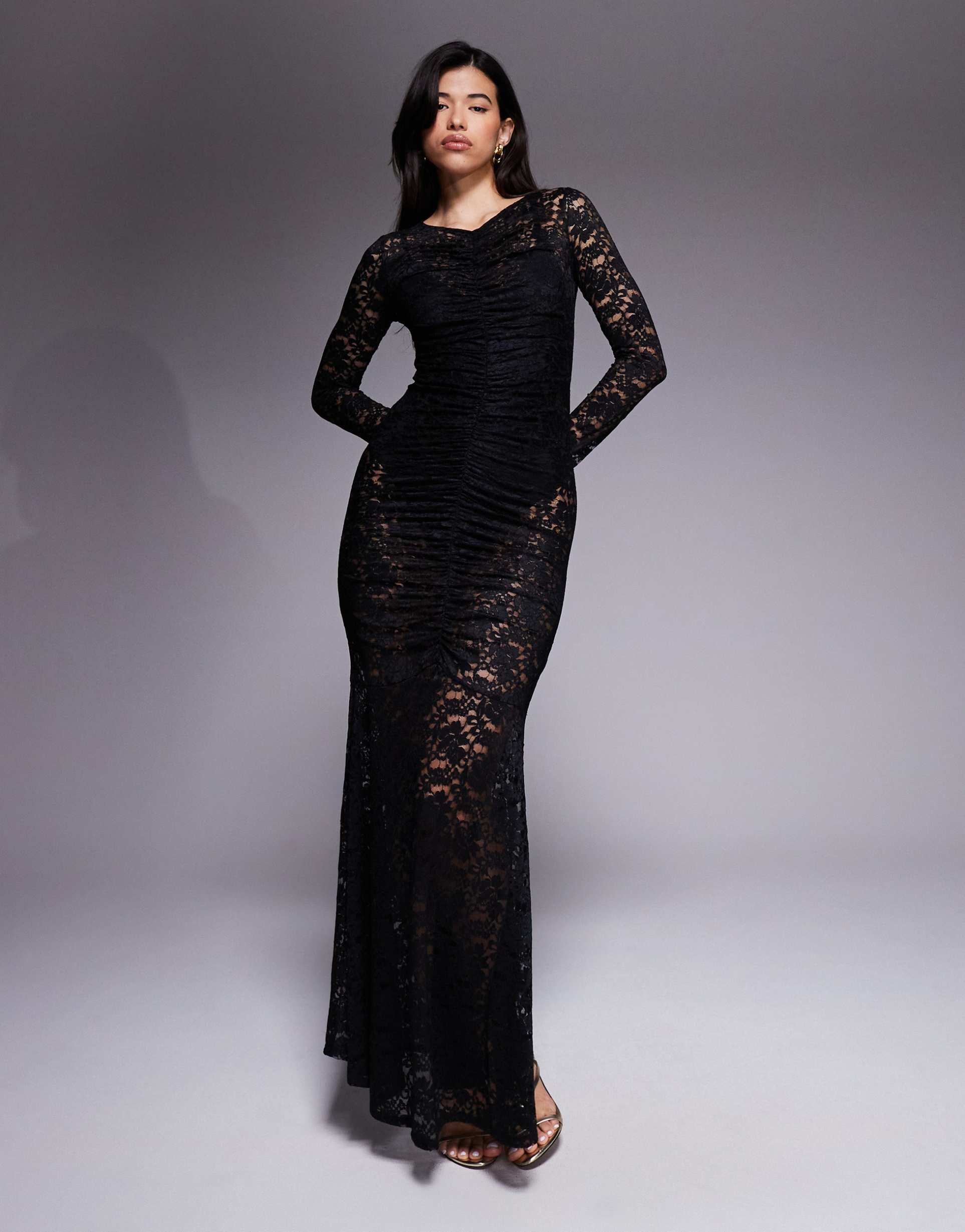 AFRM RUCHED LACE LONG SLEEVE MAXI DRESS WITH BUILT IN BODYSUIT IN BLACK