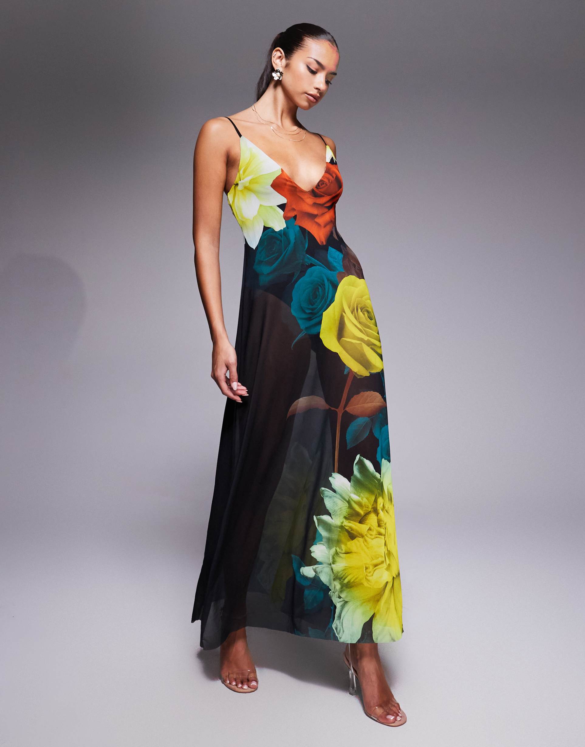 Soft and stretchy jersey fabric forms a flowing maxi slip dress featuring a daring plunge neckline and adjustable spaghetti straps for a perfect fit. The sheer black base is adorned with oversized floral prints in vibrant yellows, greens, and blues, creating a modern and sexy silhouette. Ideal for summer nights, this regular fit dress pairs effortlessly with heels for cocktail parties, date nights, or evening events. Its clean hemline and lightweight construction add to the elegant yet relaxed vibe, making it a versatile choice for stylish occasions.