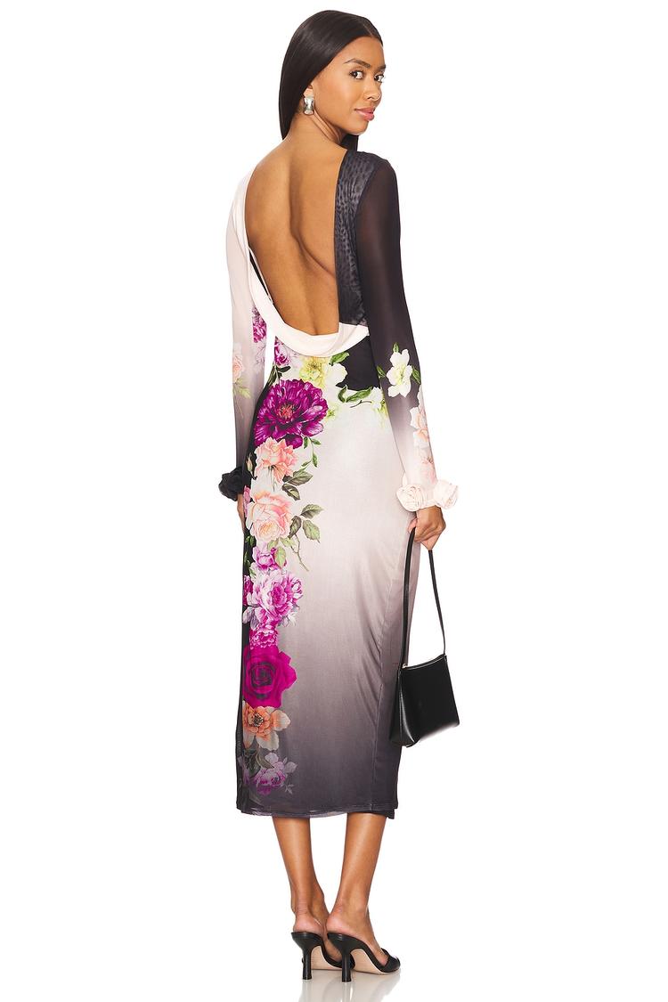 A striking sheath silhouette in matte black and cream mesh features a bold floral print cascading elegantly across the long sleeves and body. The fitted midi length flatters the figure, while the open back design adds a sophisticated edge. Crafted from a comfortable polyester-spandex blend with a detachable slip lining, this dress is perfect for cocktail parties, date nights, or stylish evening outings. The round neckline and long sleeves balance the daring back, offering a poised and elegant look for spring and autumn occasions.