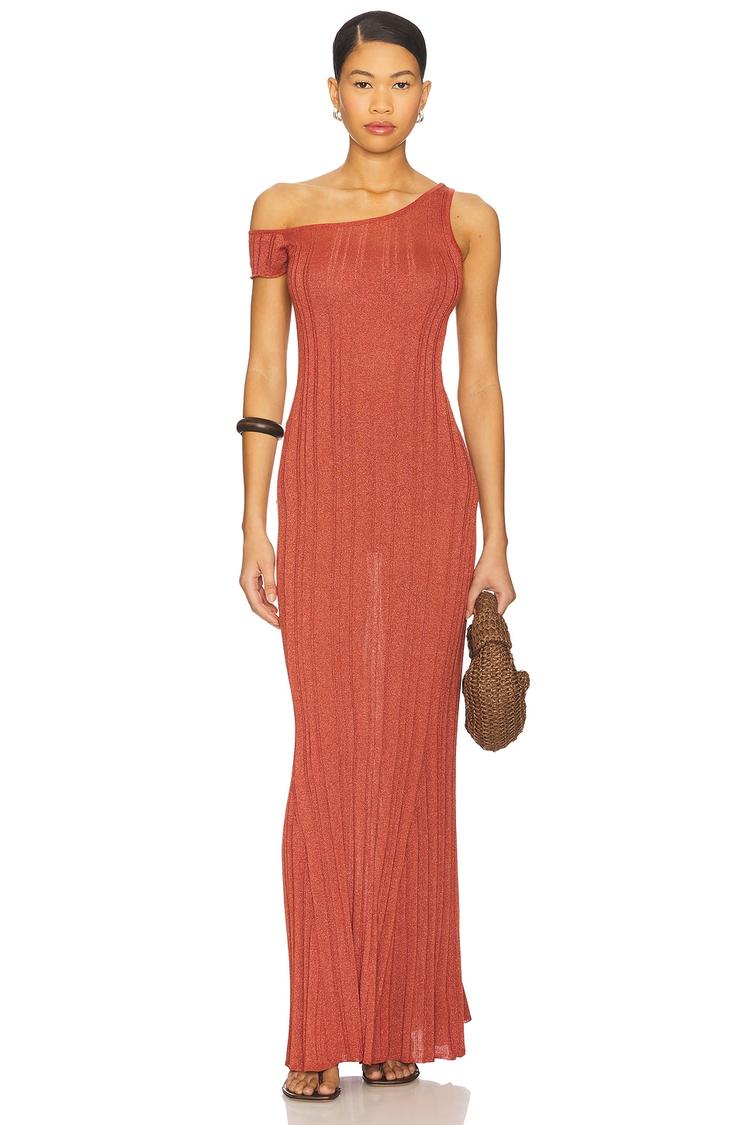 A ribbed knit maxi dress in a rich rust hue offers a slim, column silhouette with an alluring asymmetric neckline and wide strap detailing. Crafted from a midweight viscose blend with polyester and spandex, this pull-on dress delivers both comfort and a sleek fit. Its clean hem and sleeveless design make it ideal for all seasons. Effortlessly chic, it suits date nights, cocktail parties, and nights out, blending modern minimalist style with sexy sophistication.