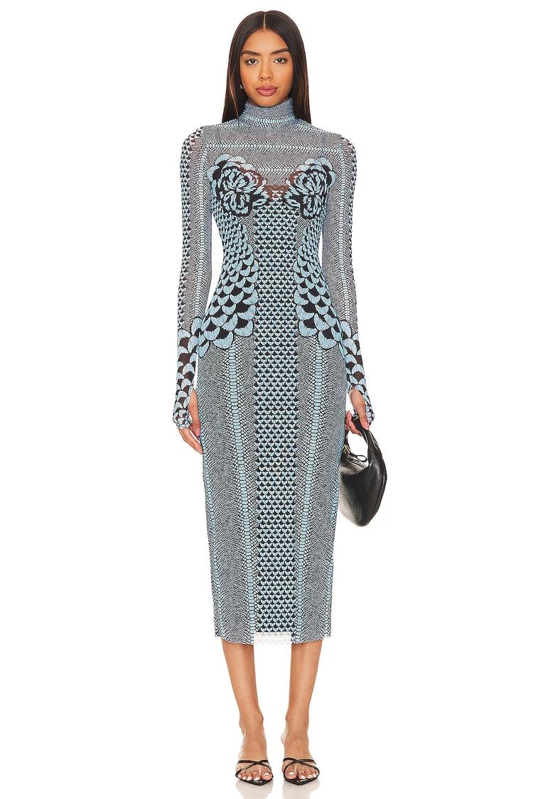 A fitted sheath silhouette in a midi length, this turtleneck dress features a modern abstract mesh pattern in matte gray and black hues. Crafted with polyester and spandex mesh fabric, it offers a sleek, body-skimming fit with long sleeves and clean hemline detailing. The pull-on styling and subtle sheer panels create a chic, elegant mood perfect for cocktail parties, night outs, or date nights. Its sophisticated design and comfortable stretch fabric make it an ideal choice for versatile evening occasions across all seasons.