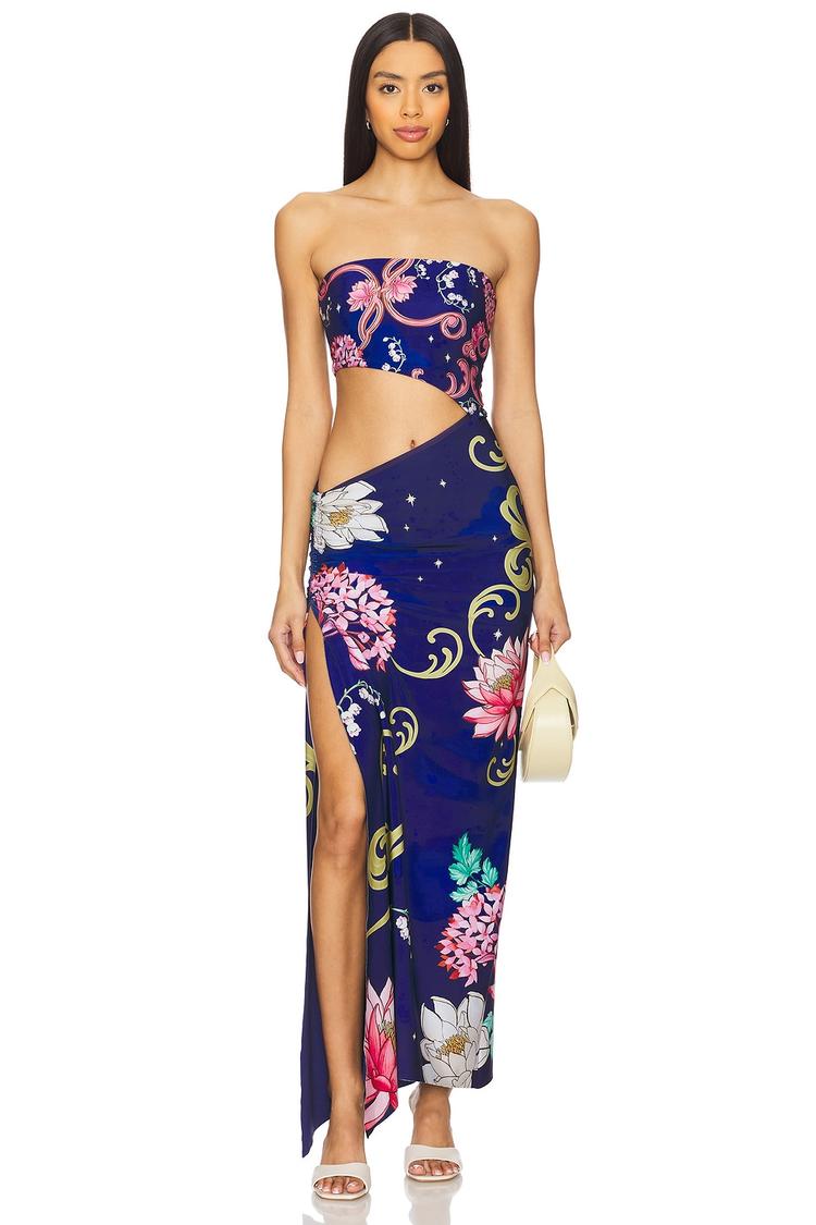 Sunlit evenings and vibrant nights come alive with this column maxi dress in a matte dark blue base adorned with bold floral prints. The straight, strapless neckline and fitted silhouette highlight the figure, while the daring side cut-out and thigh-high slit add a sexy edge. Crafted from a stretch polyester-elastane blend, it offers comfort and ease with slip-on styling. Ideal for summer brunches, date nights, or lively nights out, this trendy dress combines eye-catching design details with effortless wearability.