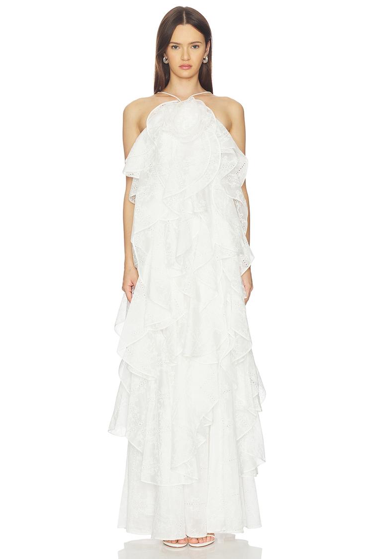 Softly tiered ruffles cascade over a flowing column silhouette, crafted from heavyweight embroidered chiffon with a fully lined finish. The halter neckline and tie-back closure add a romantic and elegant touch, making this white maxi gown perfect for formal occasions, cocktail parties, and weddings. Its sleeveless, strapless style ensures comfort and breathability for spring and summer events, while the intricate embroidery and layered hemline elevate its sophisticated charm.