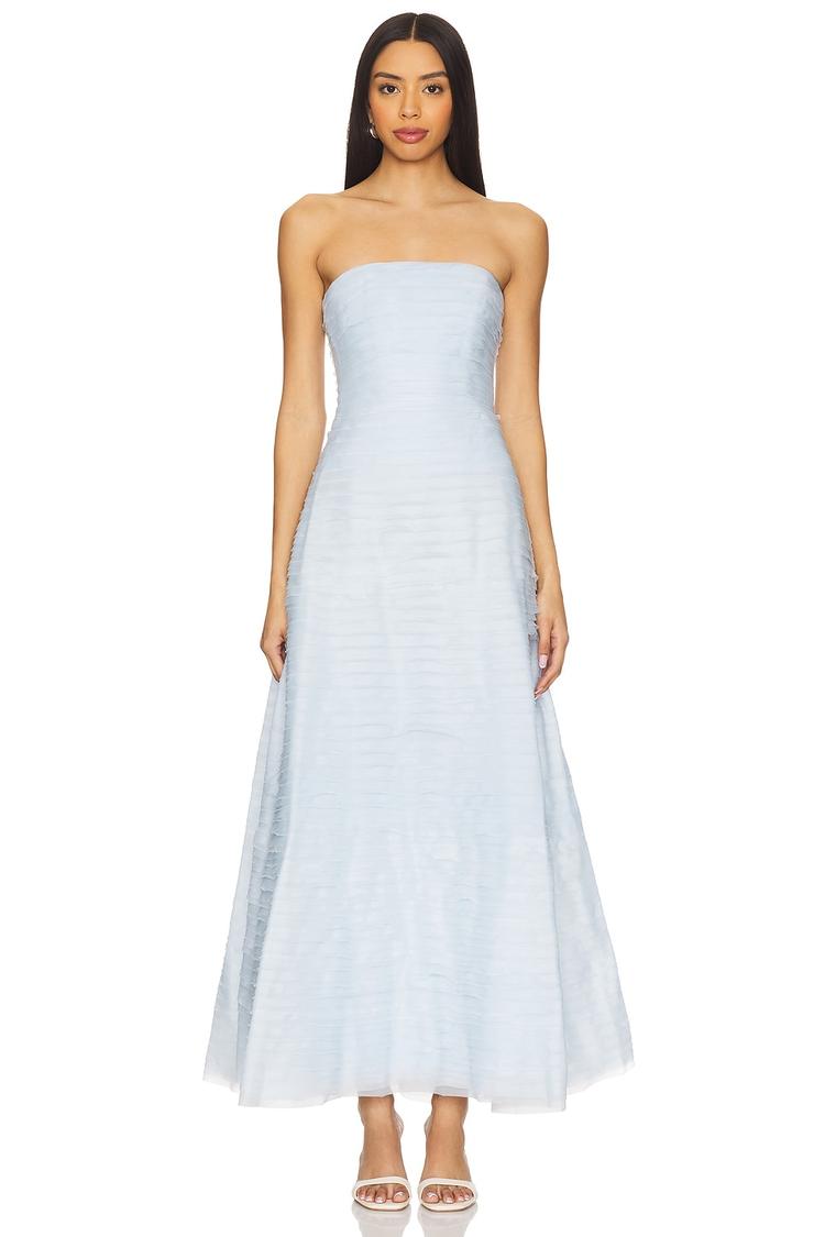 Soft matte light blue layered jersey fabric shapes a sophisticated column silhouette that flows gracefully to a clean maxi hem. The strapless neckline and fitted boned bodice create an elegant, figure-enhancing fit perfect for spring and summer occasions. A concealed back zipper with a hook and eye closure ensures a smooth finish. Ideal for cocktail parties, formal events, and wedding guests seeking timeless style and refined comfort.