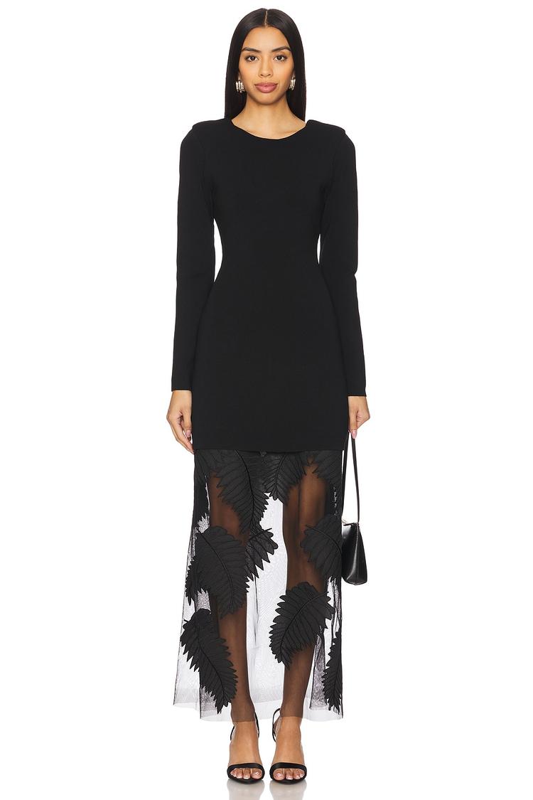 A sleek black sheath silhouette enhanced by a heavyweight jersey bodice and an embroidered mesh skirt creates a refined midi dress perfect for evening occasions. The fitted shape with long sleeves and a round neckline offers a sophisticated look, while the sheer embroidered skirt adds a touch of modern elegance. A gold-tone back zipper and padded shoulders highlight the tailored finish. Ideal for cocktail parties, date nights, and night outs, this dress combines luxurious fabrics with exquisite detailing for versatile, standout style.