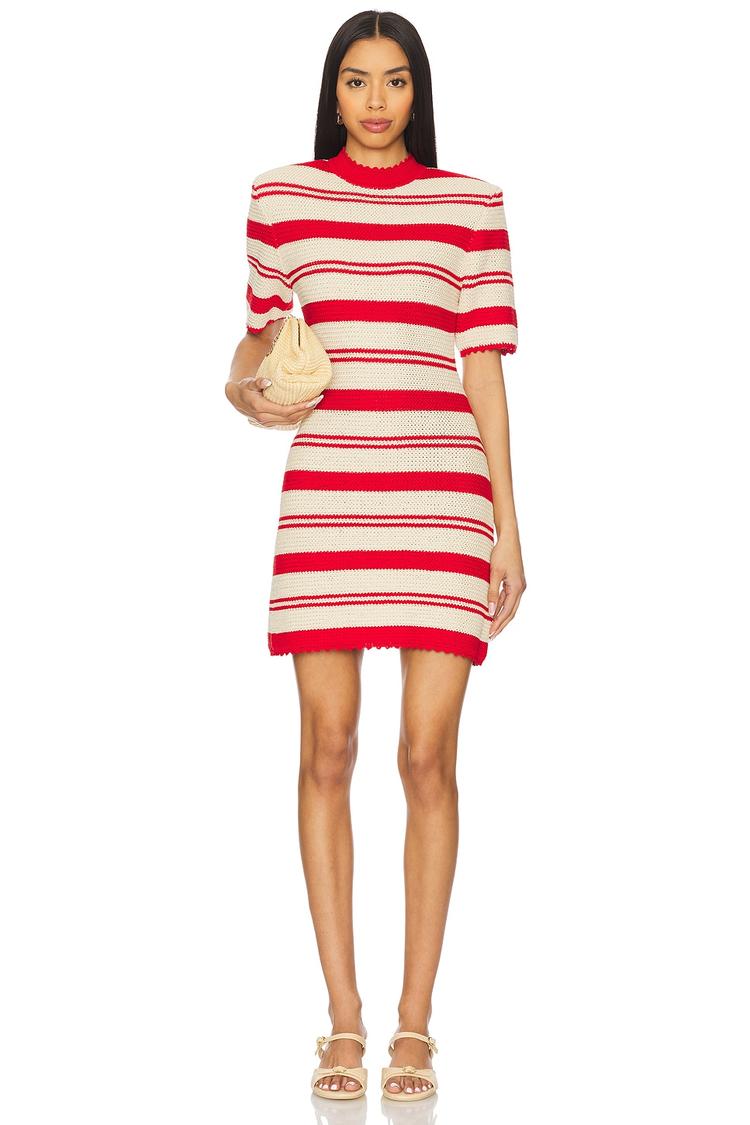 Bold red stripes contrast against a clean white backdrop in this classic shift dress crafted from heavyweight cotton crochet fabric. Featuring a high neckline and half sleeves with padded shoulders, it offers a structured yet comfortable regular fit that hits mini length for a youthful vibe. The concealed back zipper ensures a smooth silhouette while the clean hemline keeps the look polished. Perfect for casual brunches, laid-back date nights, or spring and summer street style, this versatile dress blends timeless stripes with subtle architectural details.